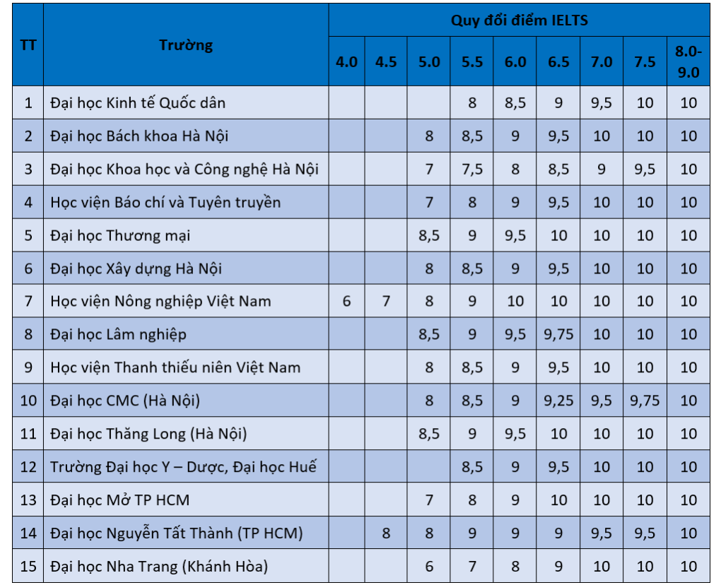 Số còn lại hầu hết yêu cầu chứng chỉ IELTS từ 5.0, tính thành 6-8 điểm môn Tiếng Anh. Từ IELTS 7.0 trở lên, nhiều trường cho thí sinh điểm 10, ví dụ Đại học Bách khoa Hà Nội, Xây dựng Hà Nội, trường Đại học Y Dược - Đại học Huế, Học viện Báo chí và Tuyên truyền.