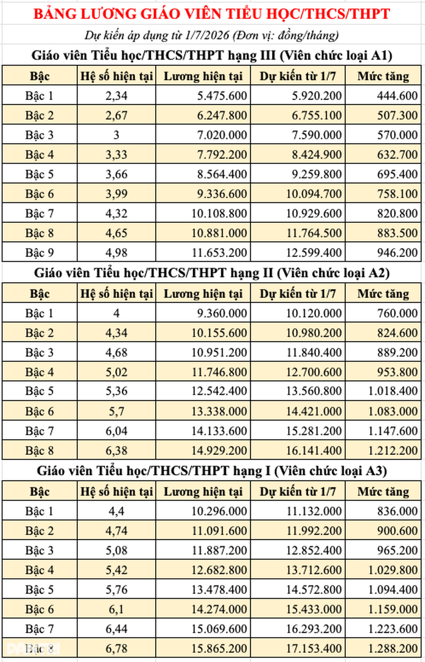 Mức tăng phổ biến đối với đa số giáo viên nằm trong khoảng từ 500.000 đến 1 triệu đồng. Những nhà giáo thuộc hạng I, bậc cao với hệ số lương 6,78 sẽ nhận mức tăng mạnh nhất, lên tới gần 1,3 triệu đồng mỗi tháng.