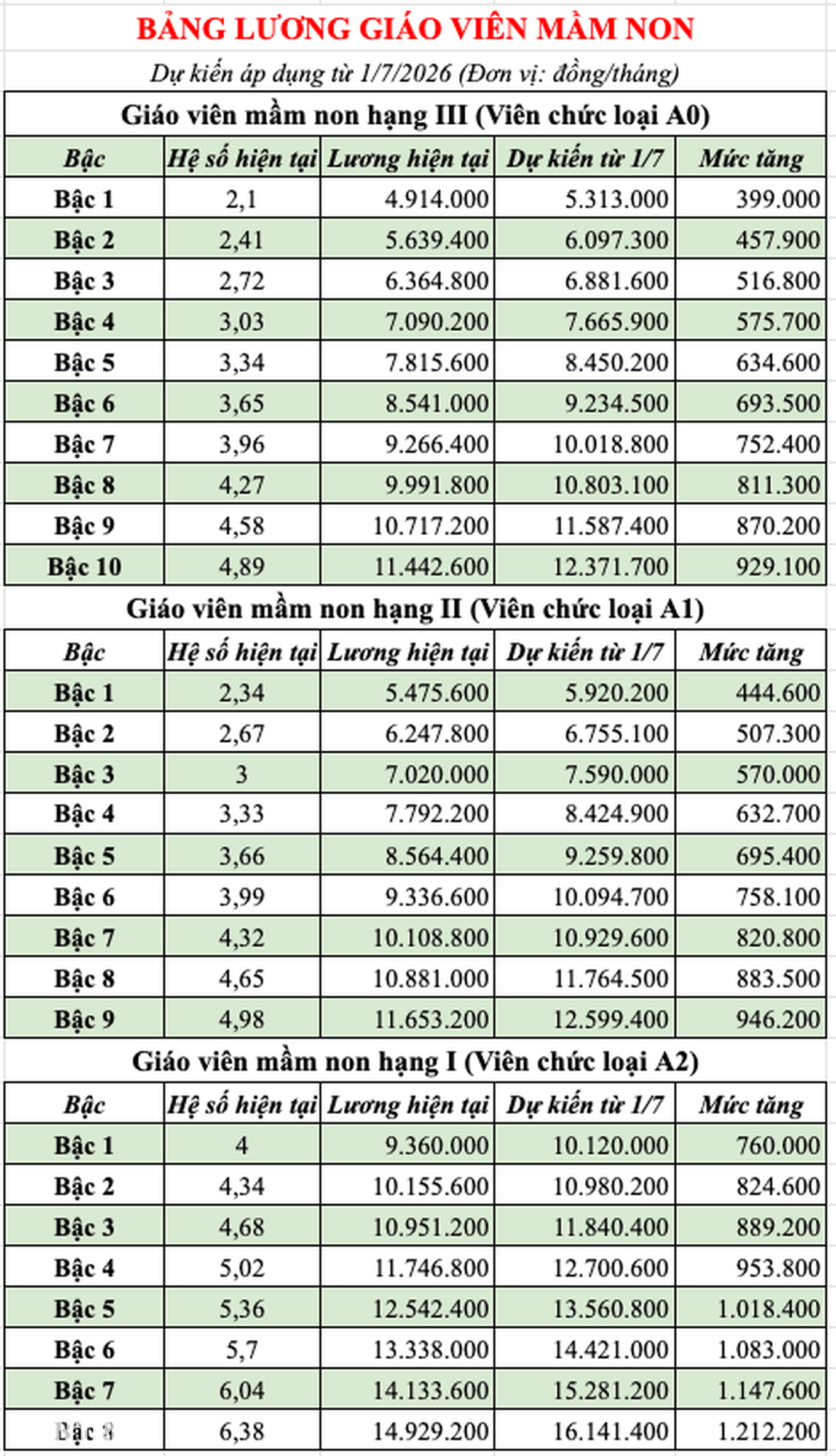 Bảng lương giáo viên mầm non dự kiến từ 1/7/2026.