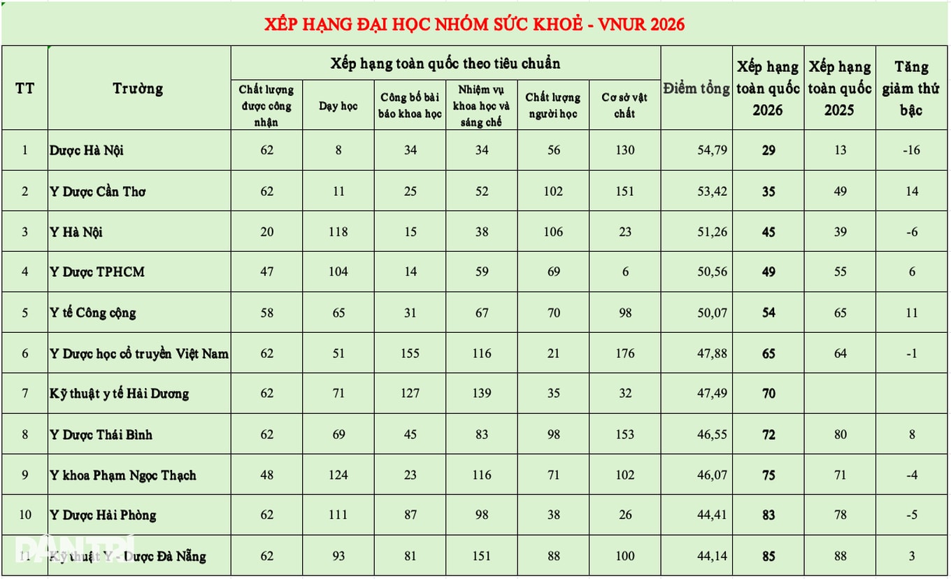 Theo kết quả VNUR năm 2026, Trường Đại học Dược Hà Nội đứng đầu nhóm ngành Sức khỏe với 54,79 điểm, xếp hạng 29 trong tổng số 193 cơ sở giáo dục được đưa vào xếp hạng chính thức.