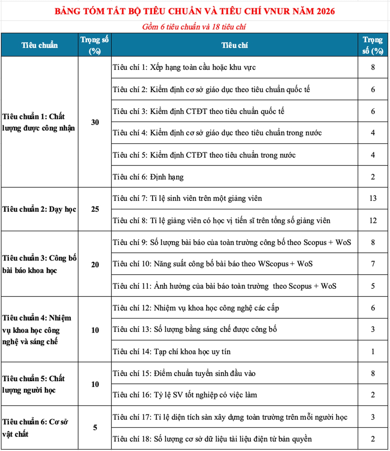 Việc xếp hạng được thực hiện thông qua Bộ tiêu chuẩn và tiêu chí VNUR-2026, gồm 6 tiêu chuẩn và 18 tiêu chí. VNUR tiếp tục được đăng ký với Tổ chức Chuyên gia Xếp hạng Quốc tế (IREG – International Ranking Experts Group) và là một trong 67 bảng xếp hạng quốc gia trên toàn cầu.