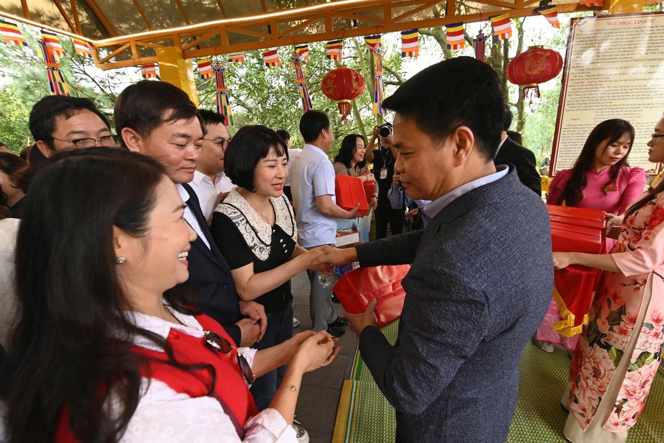 Tại Lễ tế trời đất trên núi Ngũ Nhạc thuộc di sản Côn Sơn - Kiếp Bạc, Bí thư và Chủ tịch UBND TP Hải Phòng phát ngũ cốc cho đại biểu, người dân và du khách, cầu quốc thái dân an.