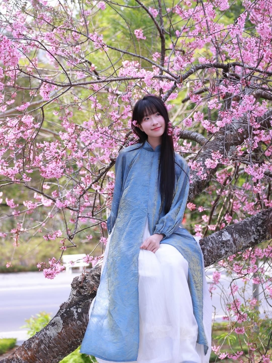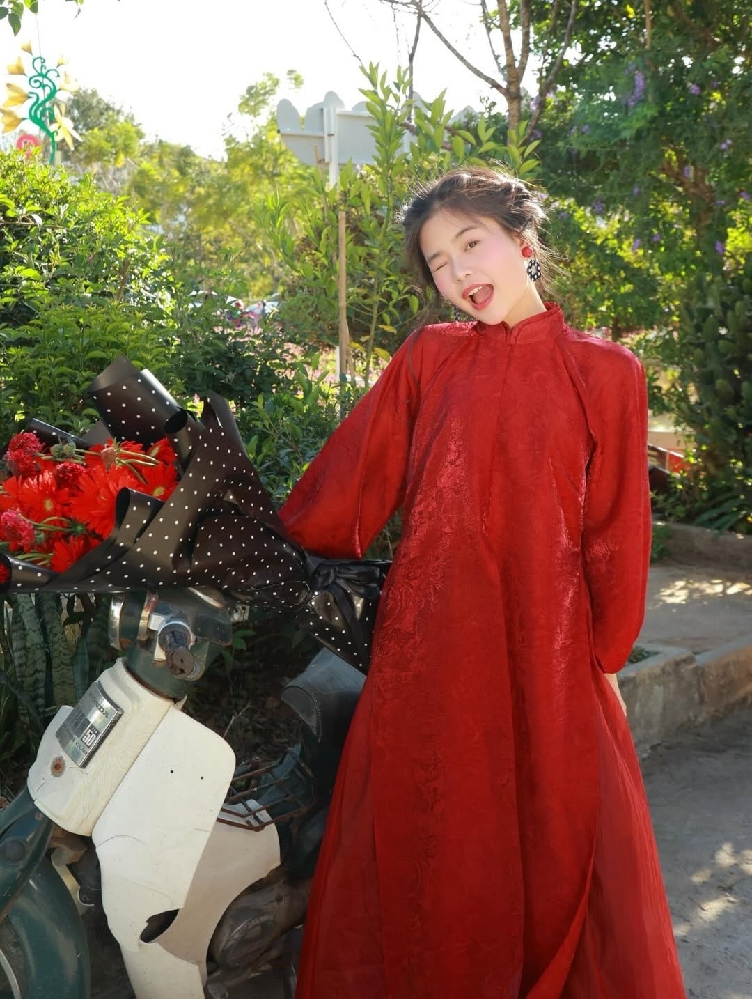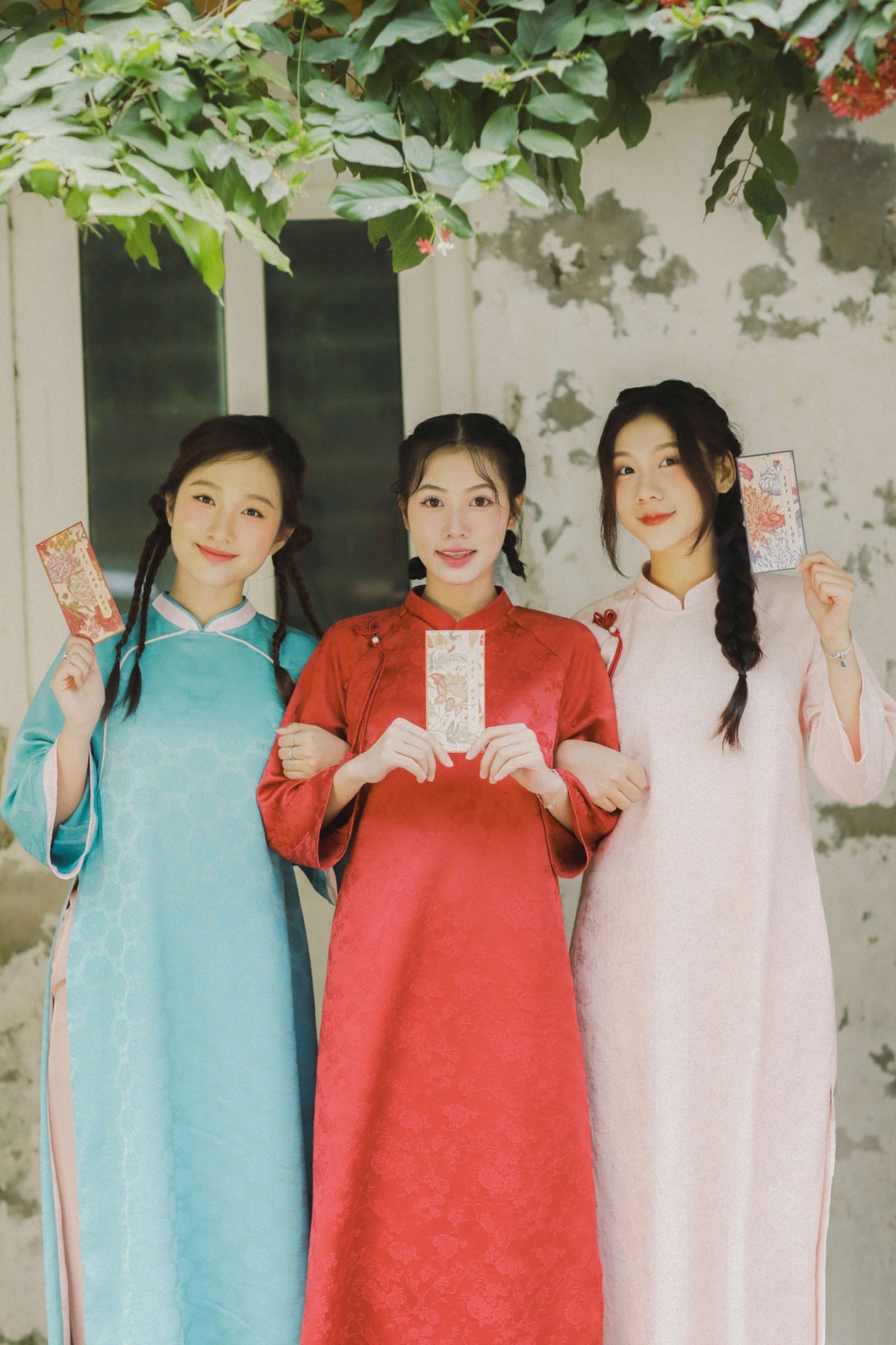 Từ đầu năm tới nay, nhiều học sinh, sinh viên rủ nhau diện áo dài trên phố, tạo dáng trước ống kính. Không khí Tết được họ truyền tải qua những phụ kiện đặc trưng như bó hoa lay ơn, thược dược, bao lì xì, cành hoa đào, giỏ quà Tết. Dưới góc nhìn của giới trẻ, áo dài trở nên gần gũi, tươi vui với bảng màu đa sắc, kiểu dáng cách tân đa dạng.