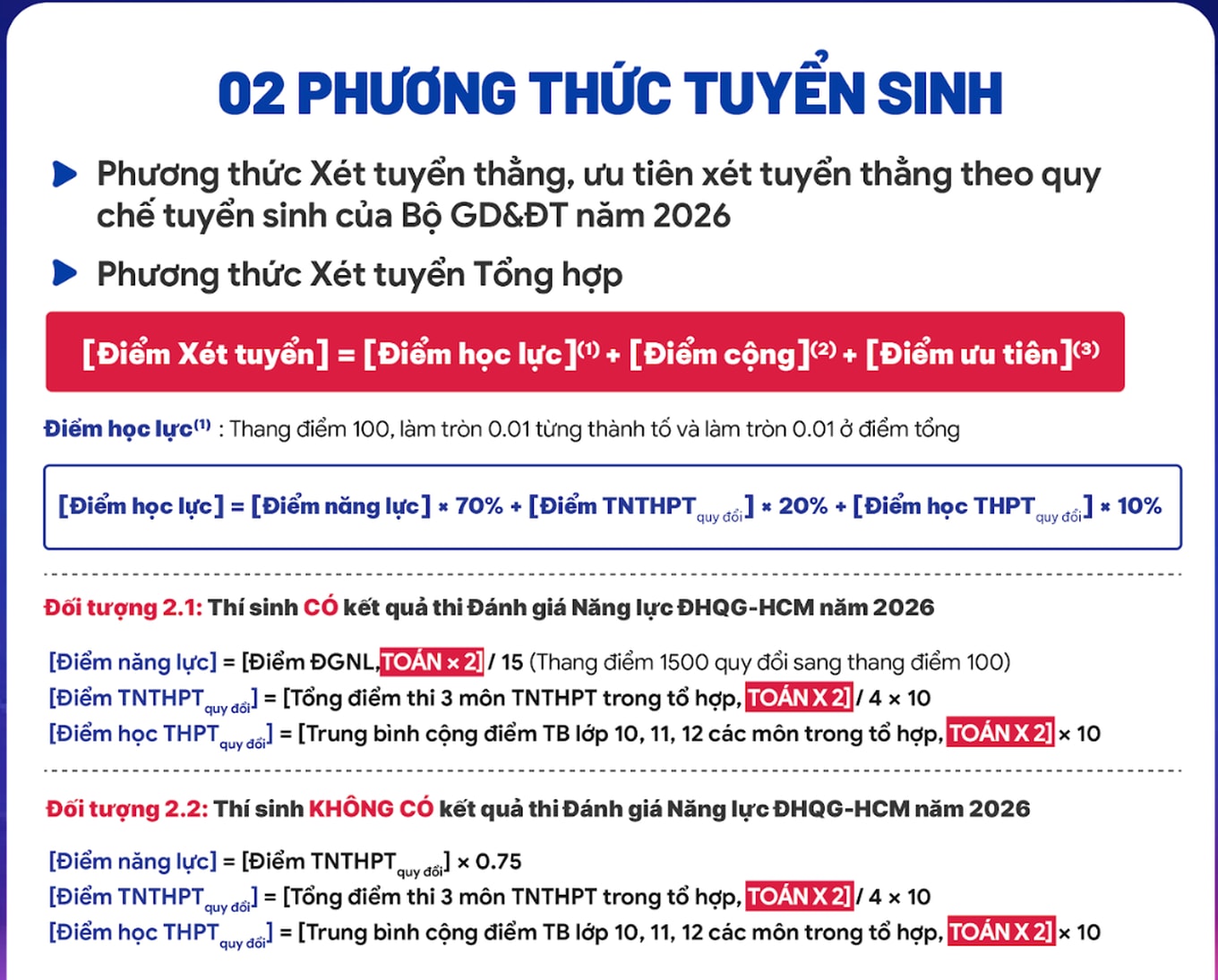 Công thức tính điểm xét tuyển của Trường Đại học Bách khoa TPHCM năm 2026 cụ thể như sau:
