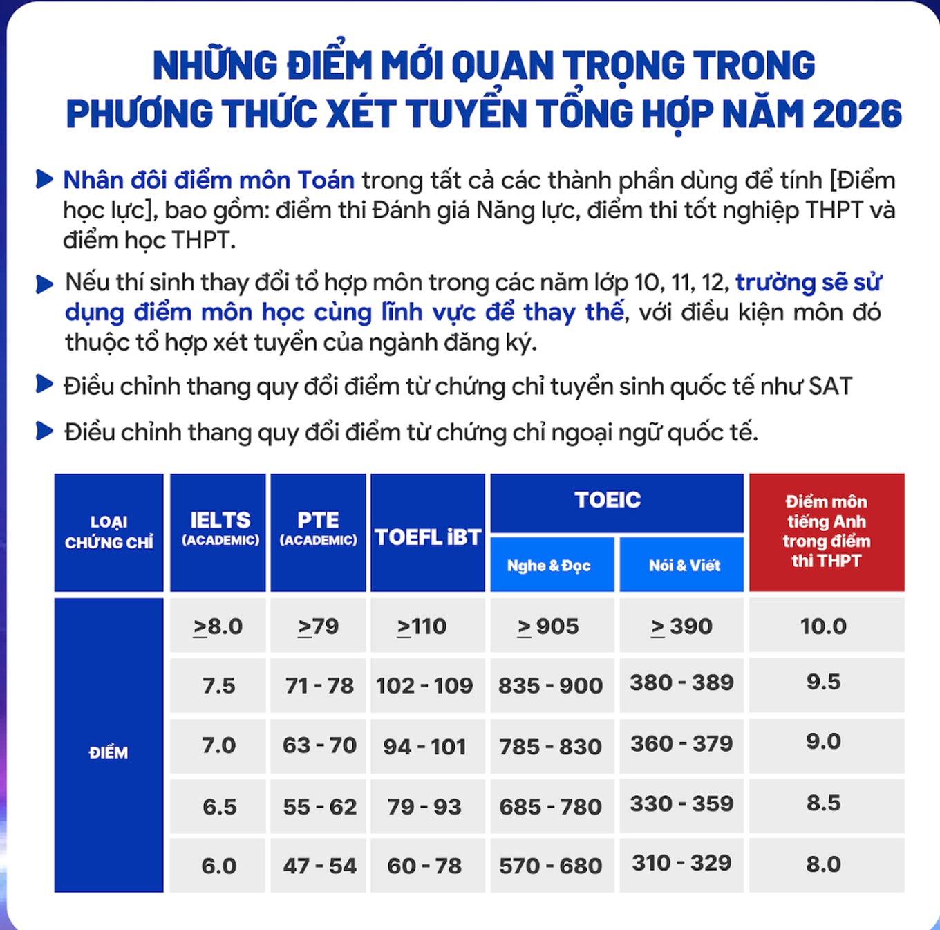 Một điểm đáng chú ý khác là Bộ thực hiện điều chỉnh thang quy đổi điểm từ chứng chỉ ngoại ngữ quốc tế theo quy chế tuyển sinh của Bộ GD&ĐT năm 2026. Bảng quy đổi ngoại ngữ quốc tế gồm 5 cấp độ chứng chỉ tương ứng với 5 mức điểm quy đổi cho môn tiếng Anh đối với các tổ hợp xét tuyển có dùng môn tiếng Anh trong thành phần điểm thi tốt nghiệp THPT.