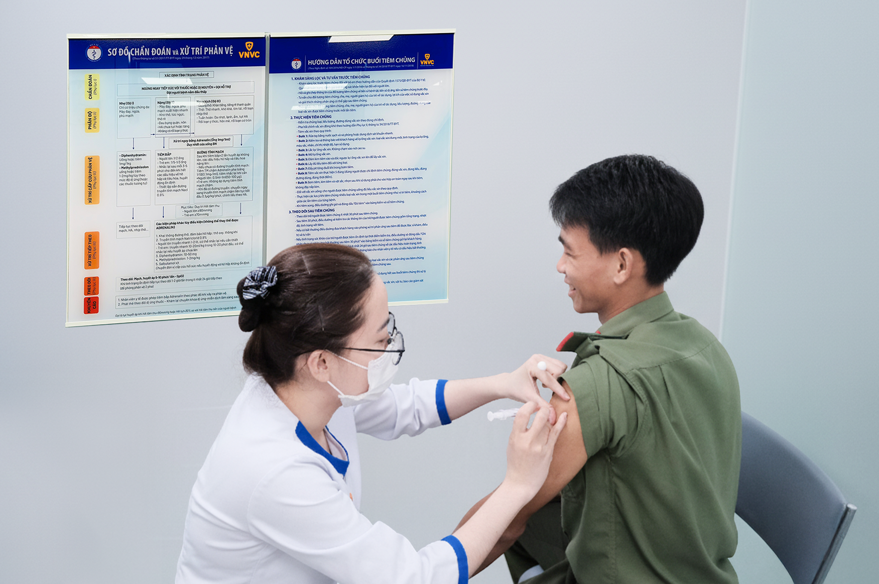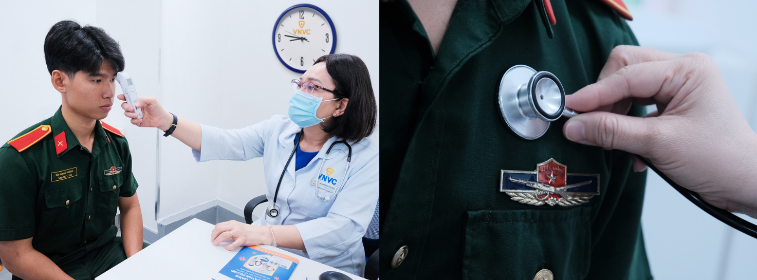 Sau khi hoàn thành nhiệm vụ, toàn đội được thăm khám và tiêm vaccine uốn ván miễn phí. Trong ảnh, nhóm cán bộ, học viên đang được VNVC tiếp đón, làm thủ tục chuẩn bị tiêm vaccine.