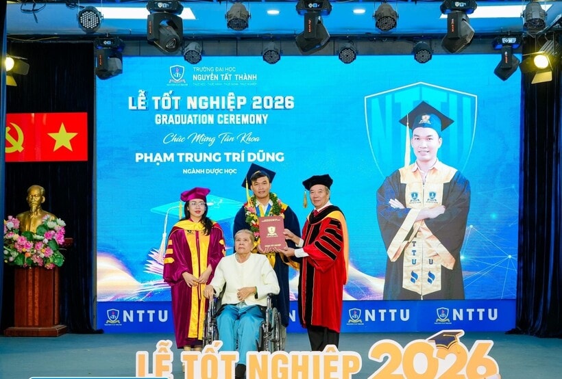 Thông tin từ Trường Đại học Nguyễn Tất Thành (TP.HCM), trong lễ tốt nghiệp mới đây của nhà trường, khi các sinh viên lần lượt bước lên bục nhận bằng, hội trường bỗng lặng đi trước một khoảnh khắc đặc biệt.