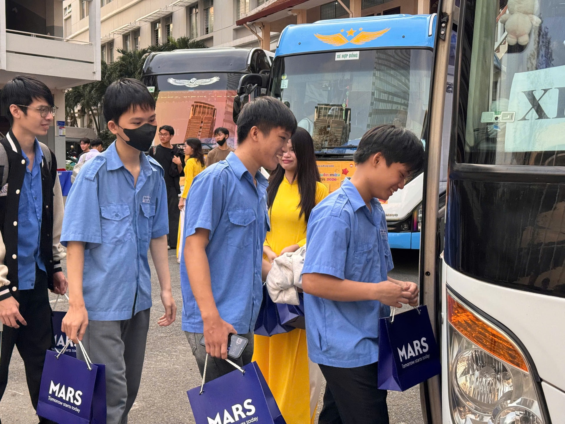 Sáng 7/2 (20 tháng chạp), sân Trường CĐ Kỹ thuật Cao Thắng (tại TP.HCM) rộn ràng hơn thường ngày. Hàng trăm sinh viên có hoàn cảnh khó khăn, chịu ảnh hưởng bởi bão lũ tại miền Trung, tay xách hành lý, vai đeo ba lô, háo hức chờ đợi giờ lên 'chuyến xe muôn màu' để bắt đầu hành trình về quê đón Tết Nguyên đán Bính Ngọ 2026.