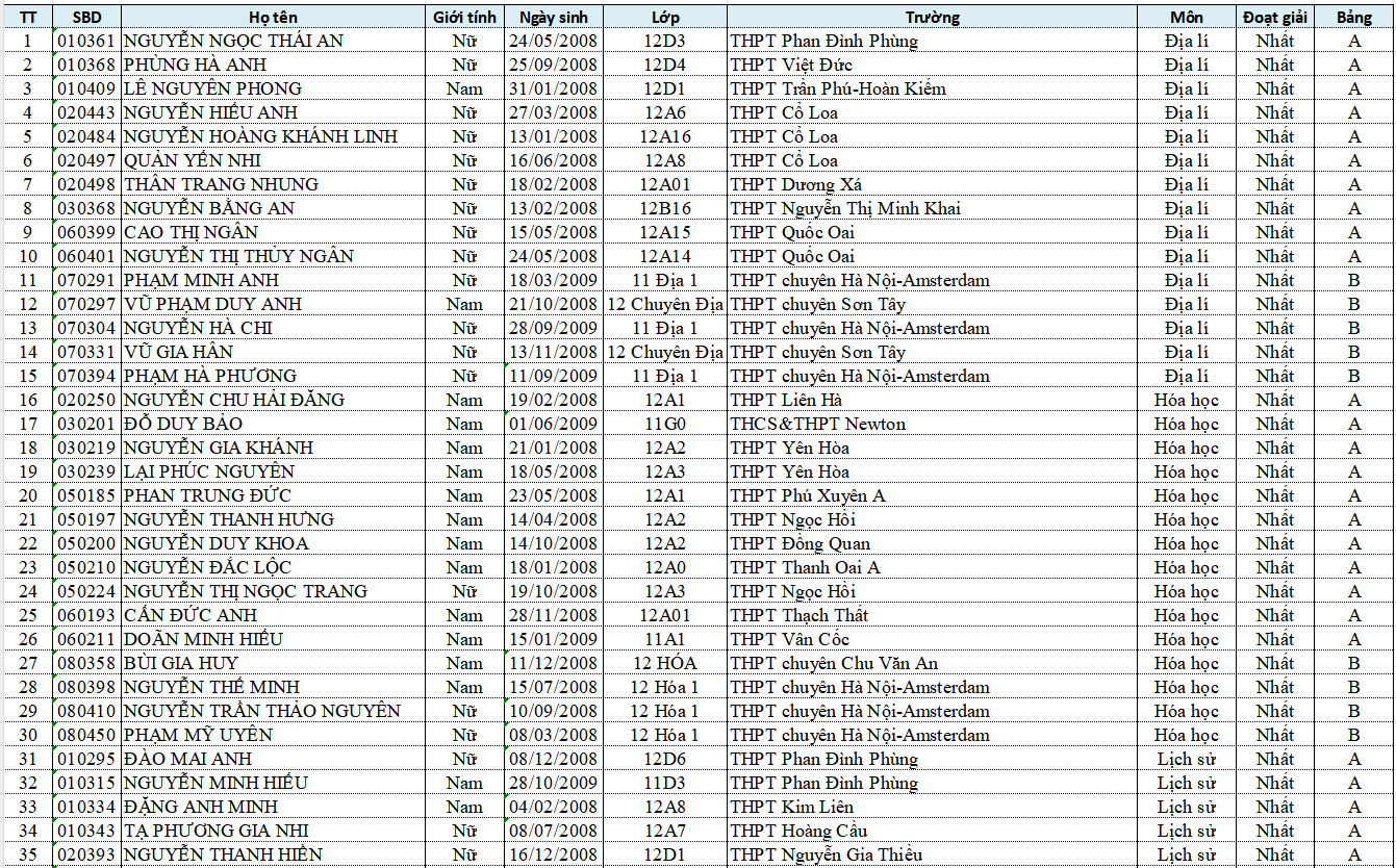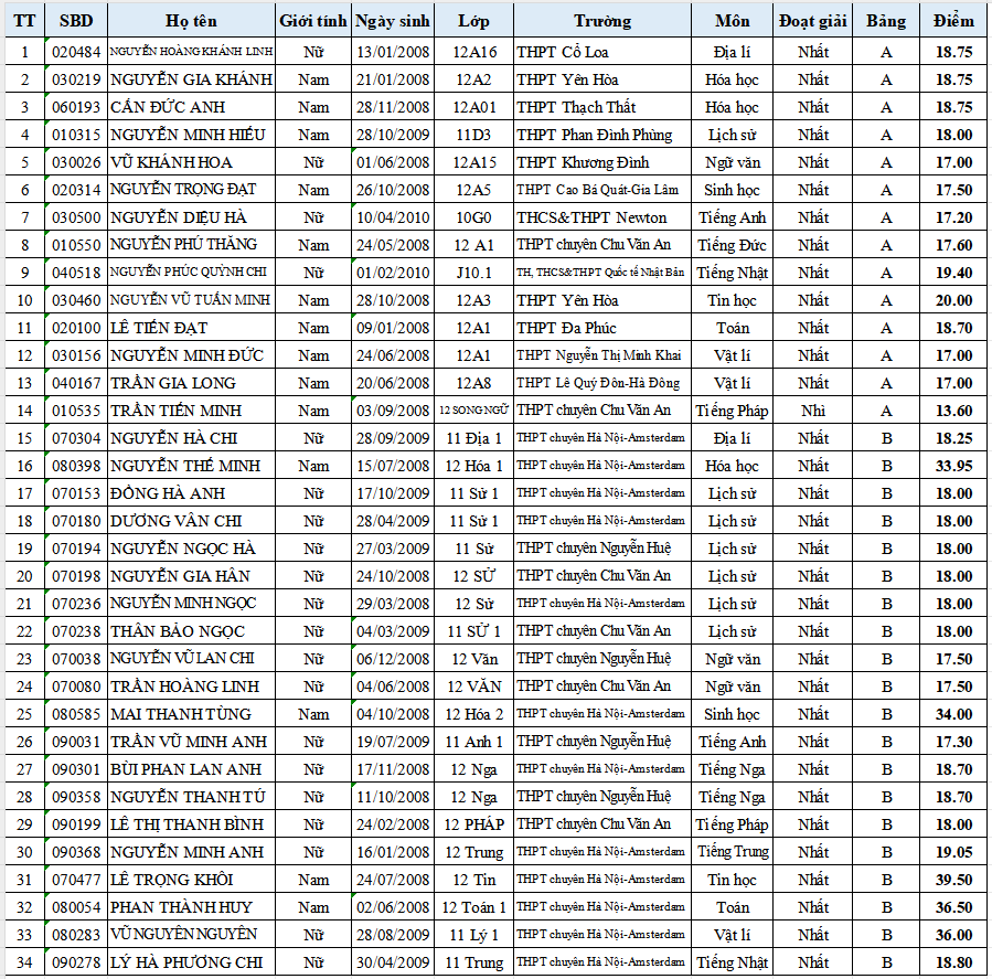 Danh sách 34 thủ khoa thi học sinh giỏi của TP Hà Nội năm học 2025-2026 như sau: