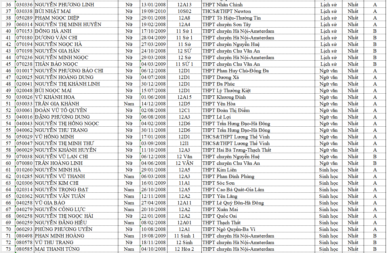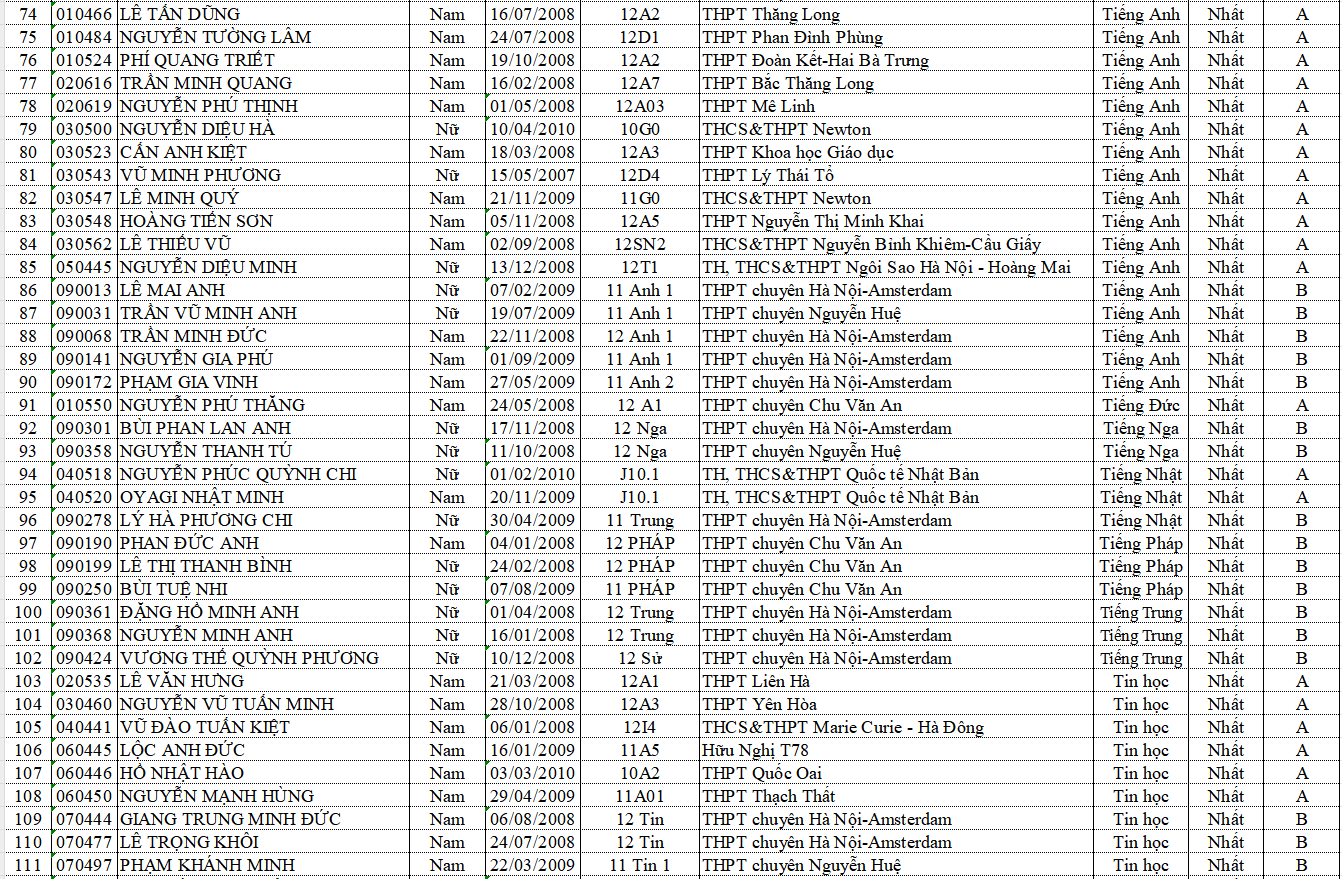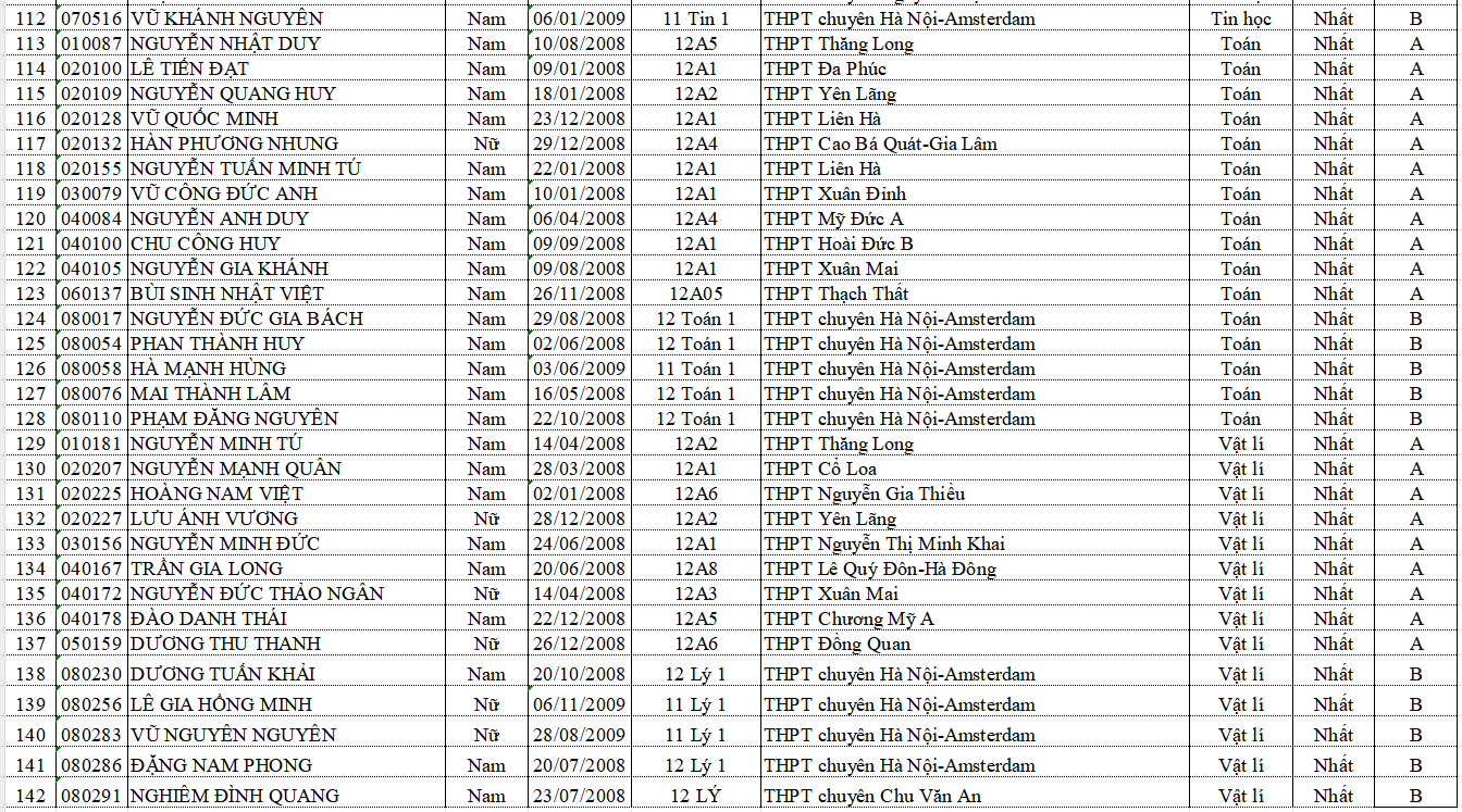 Trong số này, học sinh lớp 10 lọt vào đội tuyển của Hà Nội dự kỳ thi chọn học sinh giỏi quốc gia gồm: Nguyễn Đăng Khánh (lớp 10G0 của Trường THCS&THPT Newton; môn Toán); Vũ Quang Dũng (lớp 10 Toán 1 của Trường THPT chuyên Hà Nội -Amsterdam; môn Toán); Phạm Hồng Lương (lớp 10 Nhật của Trường THPT Chuyên Hà Nội - Amsterdam; môn Tiếng Nhật).