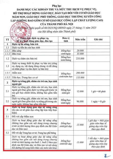 Được biết, ngày 27.11.2025, Hội đồng nhân dân thành phố Hà Nội ban hành Nghị quyết số 60/2025/NQ-HĐND về việc quy định danh mục các khoản thu và mức thu, cơ chế quản lý thu, chi đối với các dịch vụ phục vụ, hỗ trợ hoạt động giáo dục, đào tạo đối với cơ sở giáo dục mầm non, giáo dục phổ thông, giáo dục thường xuyên công lập (không bao gồm các cơ sở giáo dục công lập chất lượng cao) của thành phố Hà Nội. Trước đó là Nghị quyết số 03/2024/NQ-HĐND.