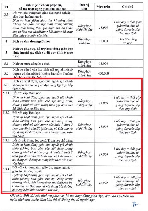 Theo danh mục các khoản thu và mức thu dịch vụ phục vụ, hỗ trợ hoạt động giáo dục và đào tạo đối với cơ sở giáo dục mầm non, giáo dục phổ thông, dịch vụ hoạt động giáo dục kỹ năng sống, hoạt động giáo dục ngoài chính khóa (do các cơ sở giáo dục công lập trực tiếp thực hiện) được quy định mức giá tối đa là 15.000 đồng/tiết.