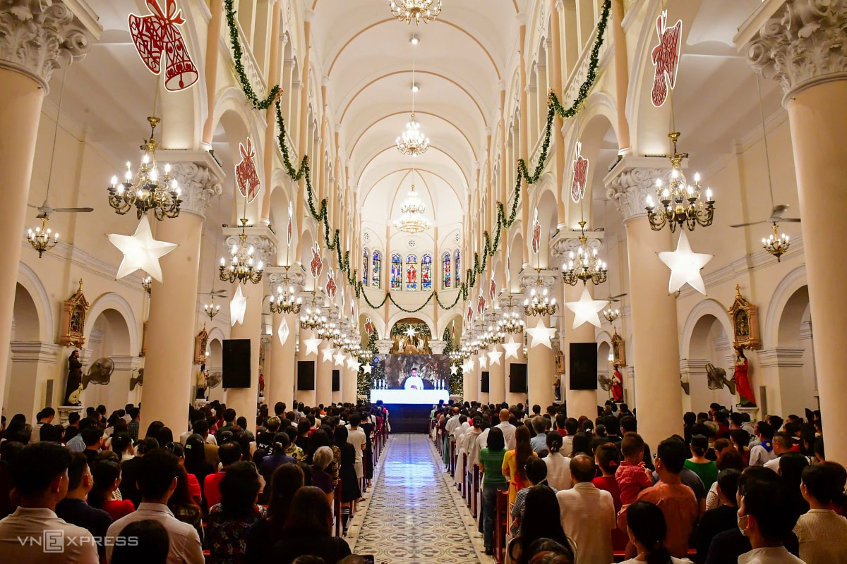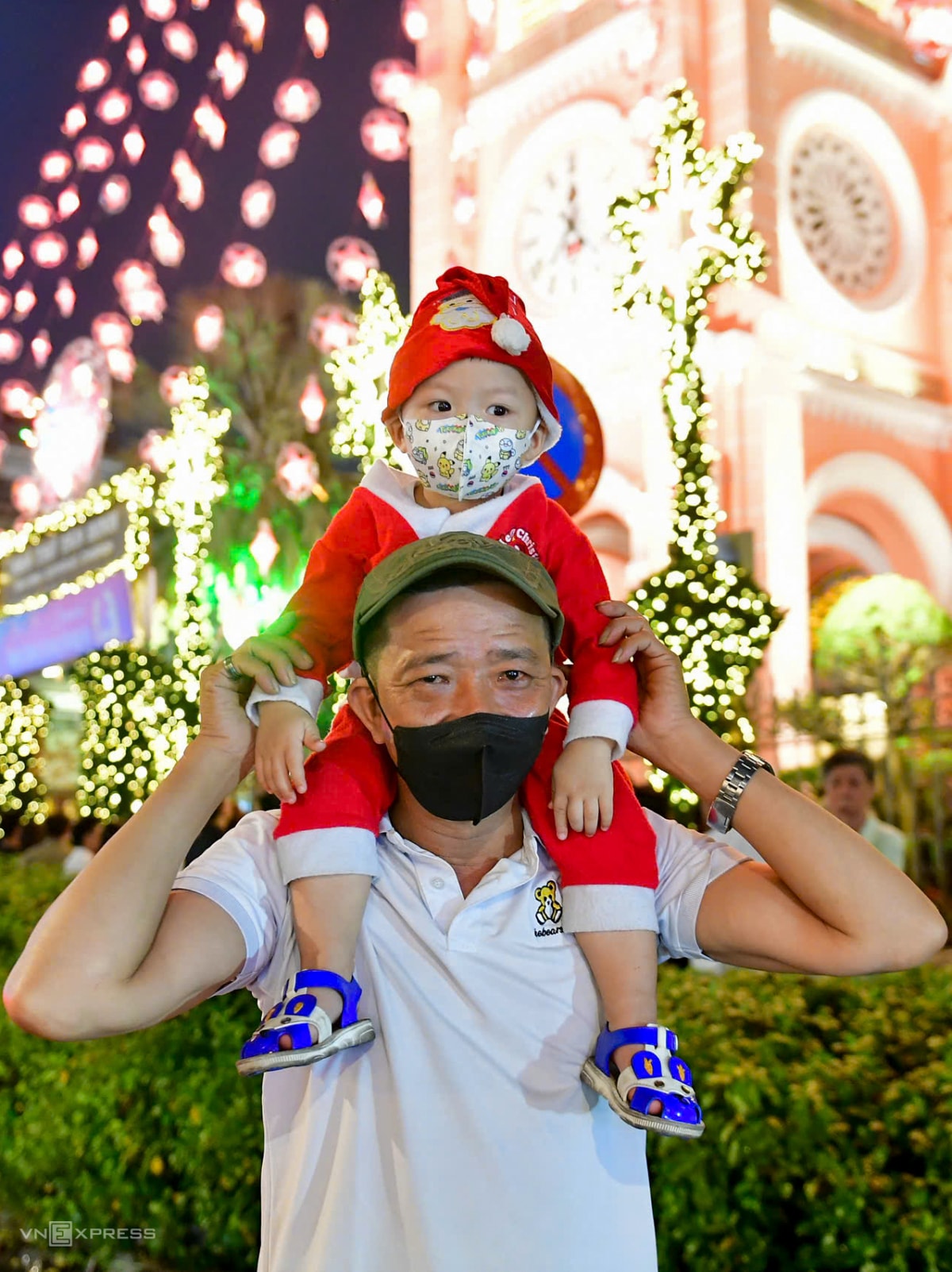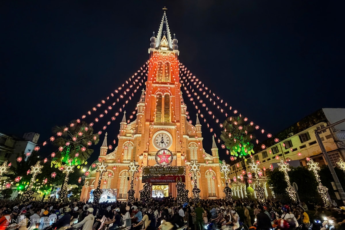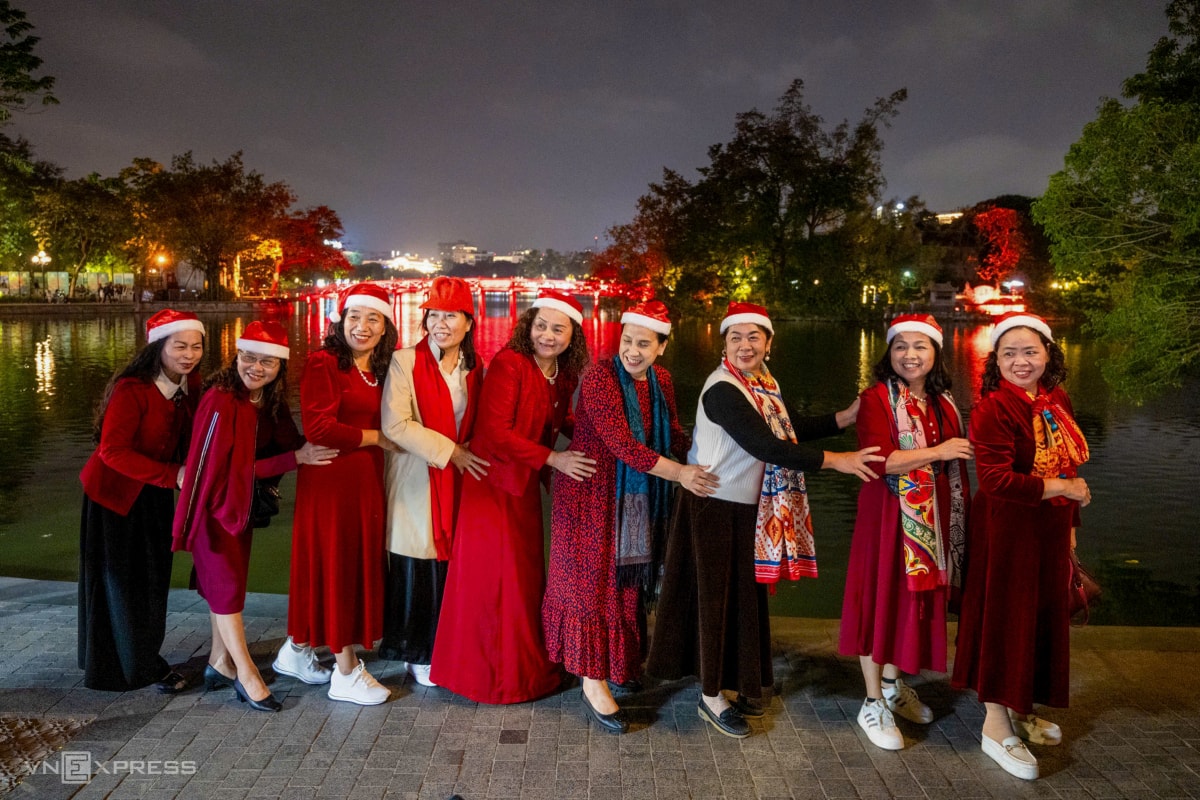Một nhóm phụ nữ mặc đồ ông già Noel chụp hình lưu niệm trước Hồ Gươm. Tối nay, tại khu vực quanh hồ UBND phường Hoàn Kiếm tổ chức chiếu sáng nghệ thuật, hoạt động mở đầu cho chuỗi chương trình văn hóa – nghệ thuật chào đón Tết Dương lịch 2026, phục vụ người dân Thủ đô và du khách trong, ngoài nước.Tại TP HCM, dòng người cũng đổ về Nhà thờ Đức Bà (phường Sài Gòn) để vui chơi trong đêm Noel. Năm nay, nhà thờ gần 160 năm tuổi lắp 1.000 km dây đèn LED thắp sáng nên nhiều ngày qua trở thành điểm check-in của giới trẻ và du khách.Cách đó khoảng 1,5 km, đông nghịt người đổ về Nhà thờ Tân Định trên đường Hai Bà Trưng, phường Xuân Hoà, dự thánh lễ. Công trình hơn 150 tuổi mang phong cách kiến trúc Roman, sơn màu hồng phấn nên được gọi là "nhà thờ màu hồng", thu hút khách nước ngoài khi tới TP HCM"Năm nào lễ gia đình tôi cũng đi cầu bình an", ông Ngô Hồng Nhật (ngụ quận 4 cũ) cõng con đi chơi lễ cho biết.Bên trong nhà thờ Tân Định đông đúc giáo dân dự thánh lễ.