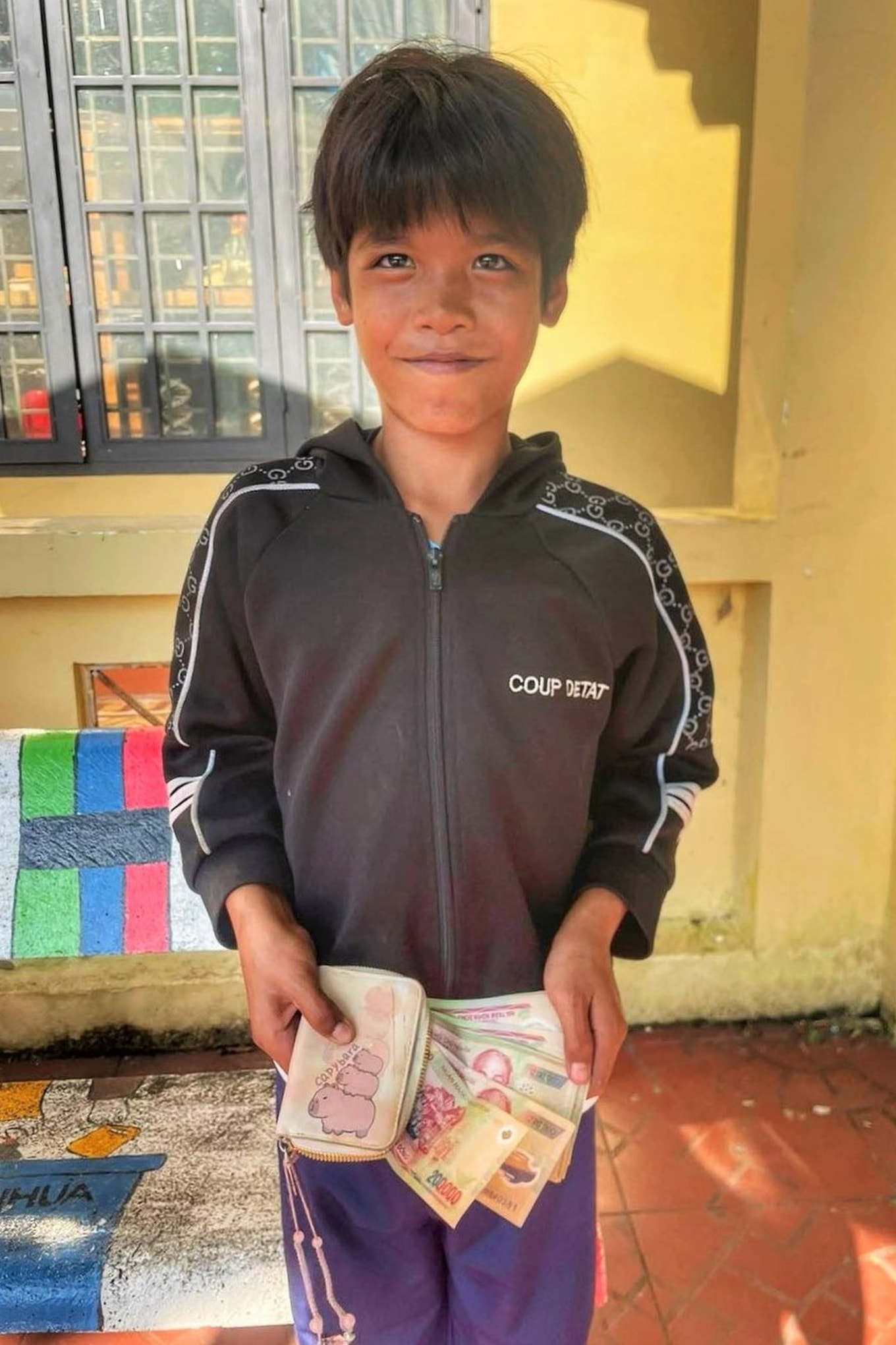 Cùng ngày, hình ảnh cậu học trò nhỏ với làn da sạm nắng, áo quần còn lấm bụi đất, đôi tay gầy gò cầm chiếc ví được chia sẻ trên mạng xã hội, nhanh chóng nhận được nhiều sự quan tâm của nhiều người.