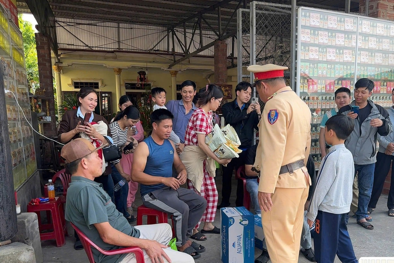 Để hỗ trợ bà con, Trạm Cảnh sát giao thông Phú Lộc đã tặng nước suối cùng bánh ngọt, ưu tiên người già và trẻ nhỏ, ổn định tâm lý hành khách.