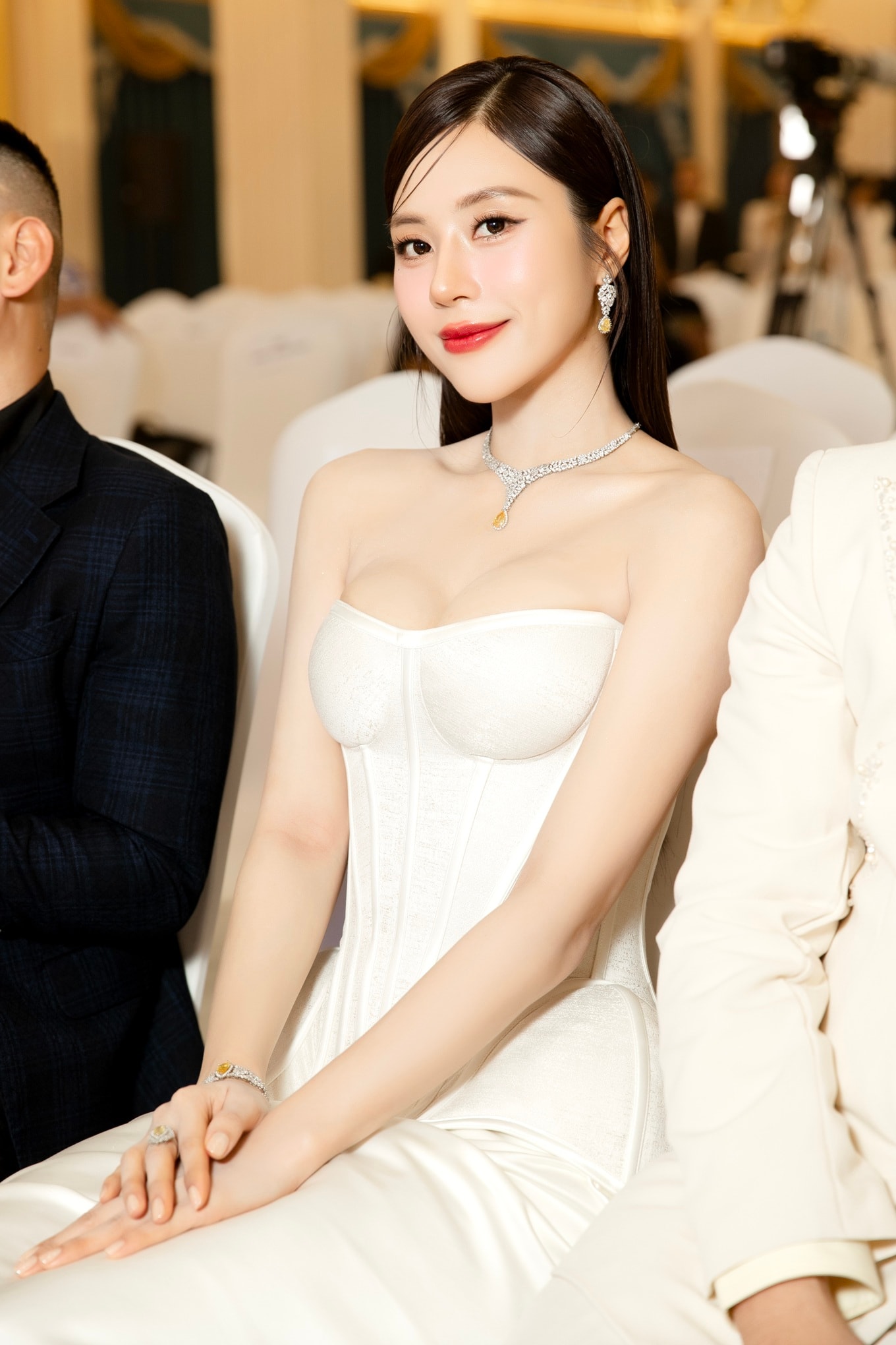 Xuất hiện tại thảm đỏ, Hoa hậu Tô Diệp Hà thu hút sự chú ý với trang phục dạ hội tông trắng. Người đẹp lựa chọn thiết kế cúp ngực, phần thân váy ôm sát theo phom corset (loại áo ôm sát thân trên), kết hợp chân váy xếp nếp. Mái tóc dài suôn thẳng giúp tổng thể trang phục thêm hài hòa.