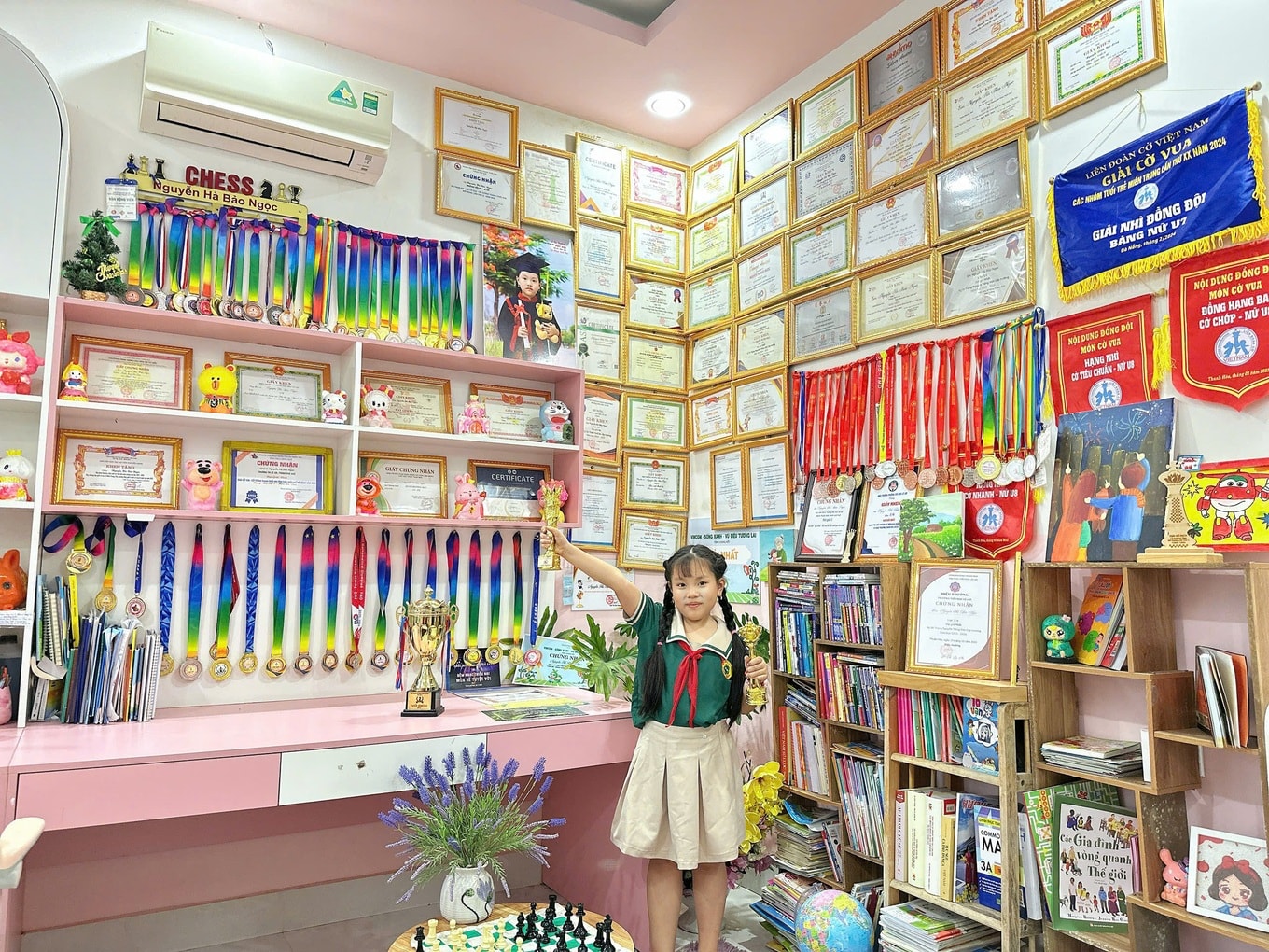 Giữa căn phòng ngập huy chương, cúp vô địch khắp 4 bức tường, chị Hà cho biết tâm đắc nhất với thành tích cờ vua của con gái.
