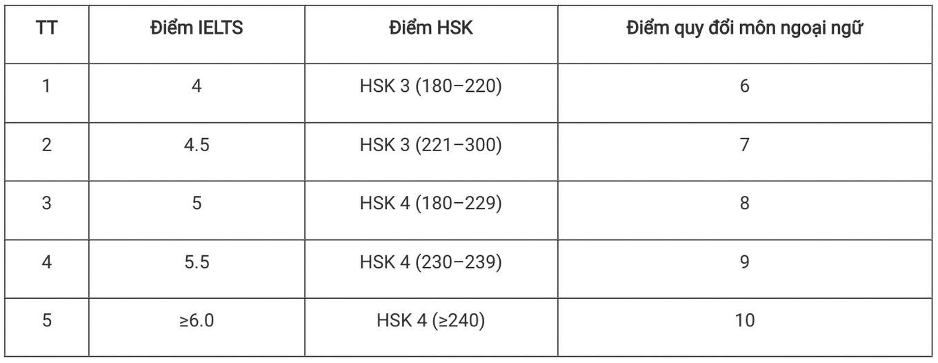 Ở phương thức xét điểm thi tốt nghiệp, nếu thí sinh không thi ngoại ngữ nhưng có chứng chỉ tiếng Anh IELTS hoặc chứng chỉ tiếng Trung HSK thì được quy đổi thành điểm ngoại ngữ trong tổ hợp xét tuyển.