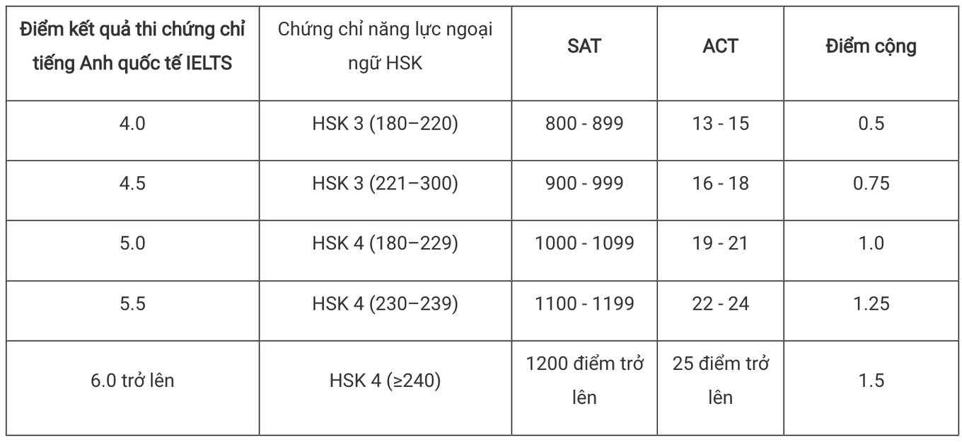 Theo đó, trường xét IELTS từ 4.0 trở lên với mức điểm quy đổi là 6. Thí sinh có IELTS 6.0 trở lên được tính điểm 10. Đây là mức quy đổi đã được trường áp dụng vào năm ngoái.