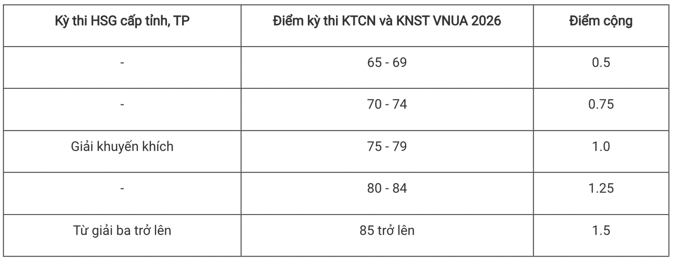 Đặc biệt, trường cộng điểm cho thí sinh tham gia kỳ thi Kiến thức công nghệ và Khởi nghiệp sáng tạo (VNUA) năm 2026 và đạt từ 85 điểm trở lên. Đây là kỳ thi riêng của nhà trường, dự kiến được tổ chức 2 đợt vào ngày 9-10/5 và 29-30/6.