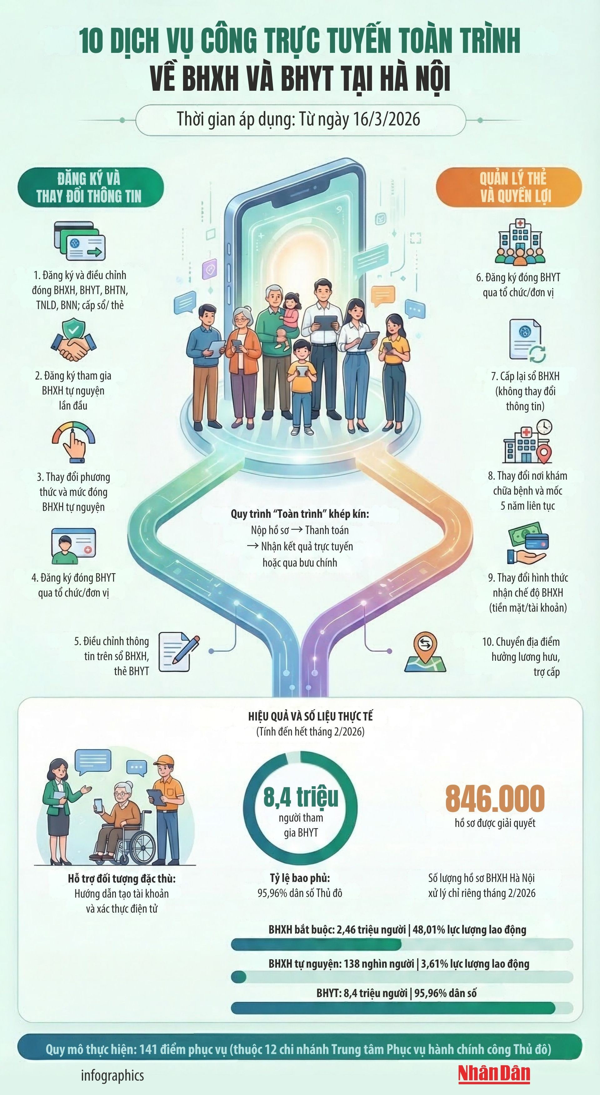 Nhằm đẩy mạnh chuyển đổi số, từ ngày 16/3/2026, Hà Nội triển khai 10 thủ tục hành chính toàn trình lĩnh vực bảo hiểm xã hội, bảo hiểm y tế. Bước tiến này giúp người dân, doanh nghiệp giao dịch hoàn toàn trên môi trường điện tử, tiết kiệm tối đa thời gian và chi phí.