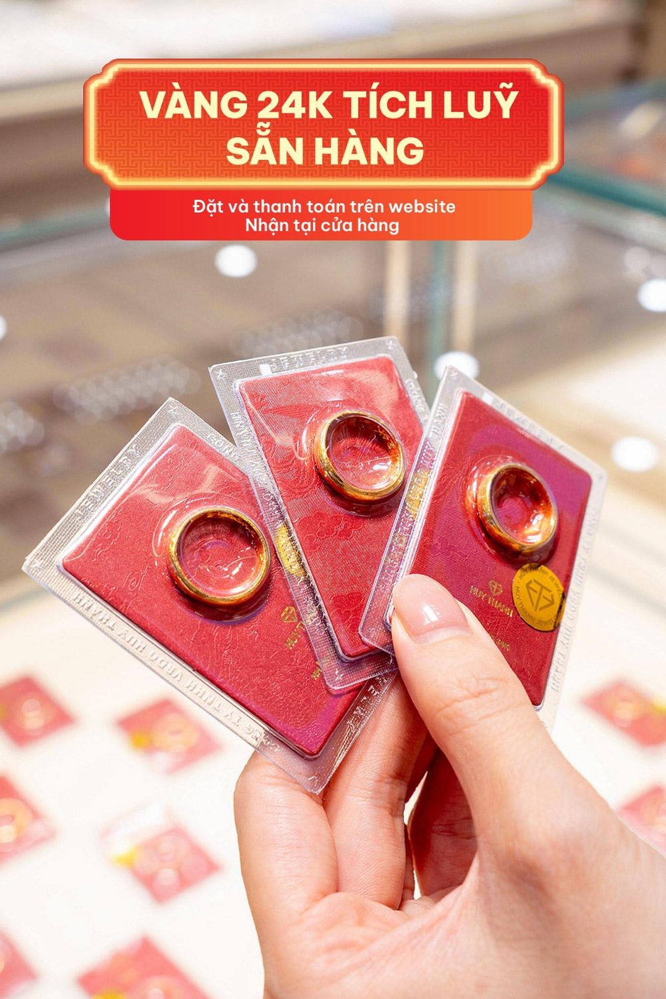 Đối với nhu cầu tích trữ tài sản, Huy Thanh Jewelry cung cấp các sản phẩm vàng 24K, từ miếng vàng ép vỉ với hình ông Thần Tài cho đến các nhẫn tròn trơn với trọng lượng từ 0,1 chỉ đến 3 chỉ.