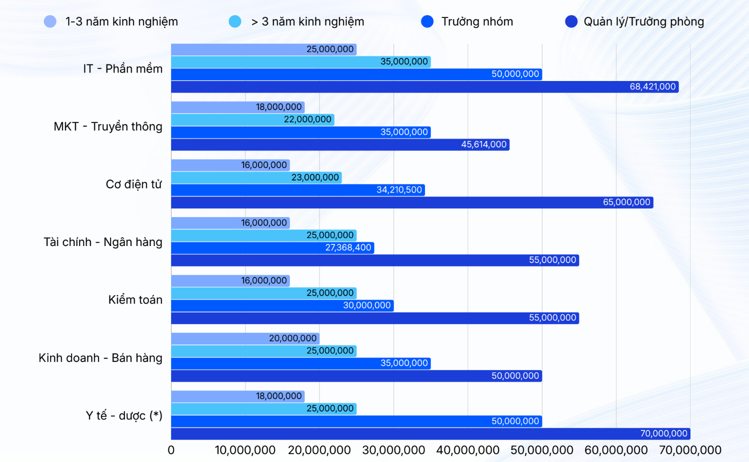 Cụ thể, ở nhóm quản lý hoặc trưởng phòng, ngành Y tế - Dược ghi nhận mức lương trung vị cao nhất, khoảng 70 triệu đồng/tháng, trong khi IT - Phần mềm cao nhất là hơn 68,4 triệu đồng/tháng.