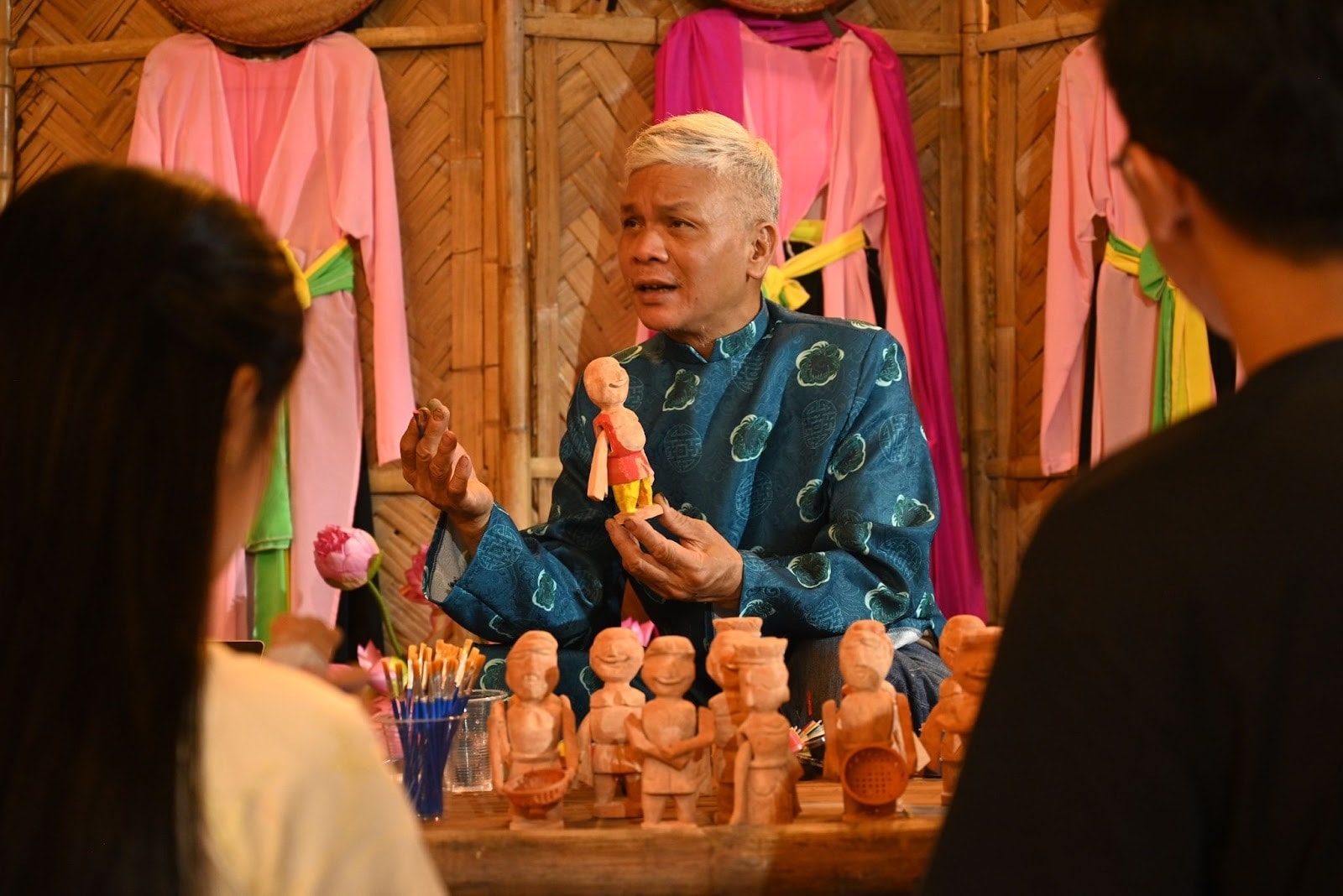 Trung tâm của workshop là khu vực tô màu trên rối mộc. Tại đây, người tham gia được trực tiếp làm việc với chất liệu gỗ, tự tay lựa chọn màu sắc, đường nét và hoàn thiện tạo hình theo cảm nhận cá nhân. Không khí tại khu vực này luôn sôi nổi, khi tiếng cọ quệt màu xen lẫn những cuộc trao đổi về hình khối, bố cục và ý nghĩa biểu đạt của từng chi tiết. Dưới sự hướng dẫn của NSƯT Đặng Duy Bằng - nghệ nhân có hơn 30 năm gắn bó với nghề chế tác rối người trẻ được tiếp cận không chỉ kỹ thuật tạo hình, mà cả tư duy thẩm mỹ phía sau mỗi nhân vật.