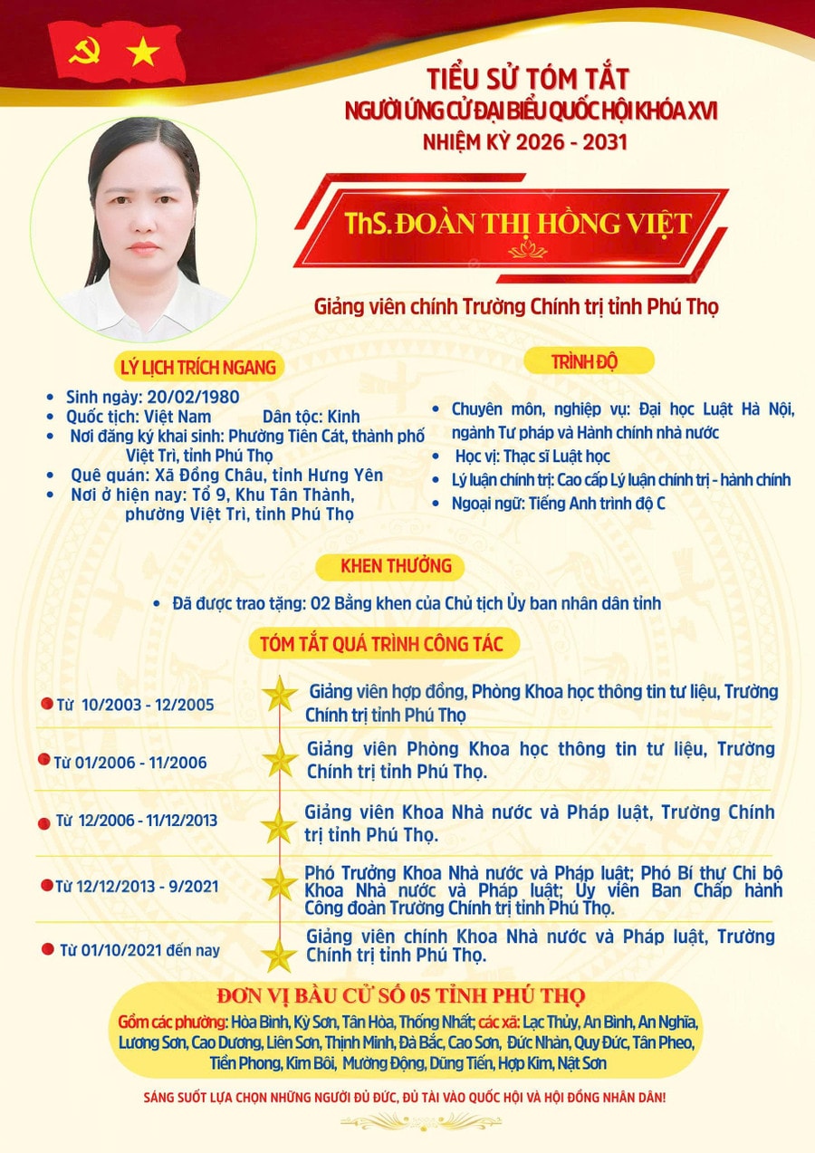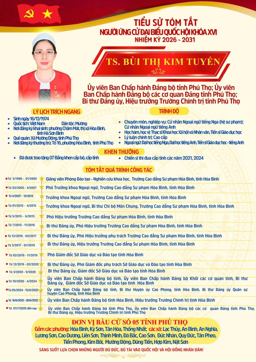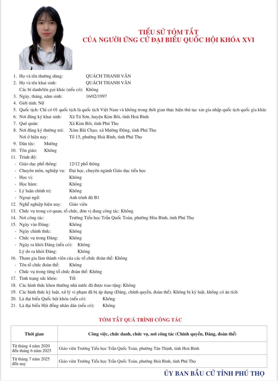 Tại Phú Thọ, danh sách ứng cử đại biểu Quốc hội khóa XVI có 29 người tại 6 đơn vị bầu cử, trong đó 4 ứng viên đang công tác trong lĩnh vực giáo dục. Các ứng viên gồm Quách Thanh Vân, giáo viên Trường Tiểu học Trần Quốc Toản (TP Việt Trì); Bùi Thị Kim Tuyến, Bí thư Đảng ủy, Hiệu trưởng Trường Chính trị tỉnh Phú Thọ; Đoàn Thị Hồng Việt, giảng viên Trường Chính trị tỉnh; và Trần Thu Thủy, giảng viên Khoa Tiếng Anh, Trường Đại học Hùng Vương.