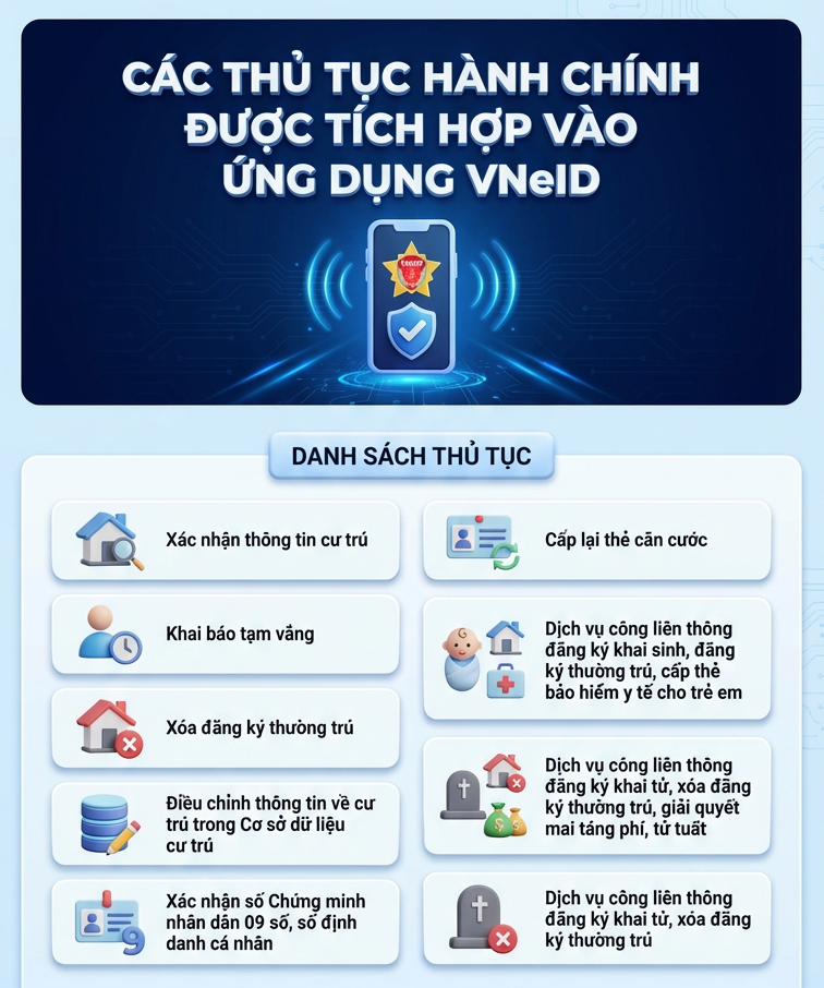 Để tăng thêm sự lựa chọn và tiện ích cho người dân khi thực hiện dịch vụ công trực tuyến, Bộ Công an đã hoàn thiện triển khai thêm 9 dịch vụ công trên Ứng dụng VNeID bao gồm:
