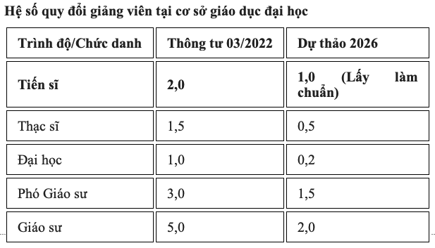 Như vậy, dự thảo thông tư mới cho thấy xu hướng "siết" chặt hơn và coi trọng trình độ tiến sĩ hơn so với quy định cũ, thể hiện qua so sánh hệ số quy đổi giữa thông tư hiện hành (ban hành năm 2022 và sửa đổi năm 2023), cụ thể như sau: