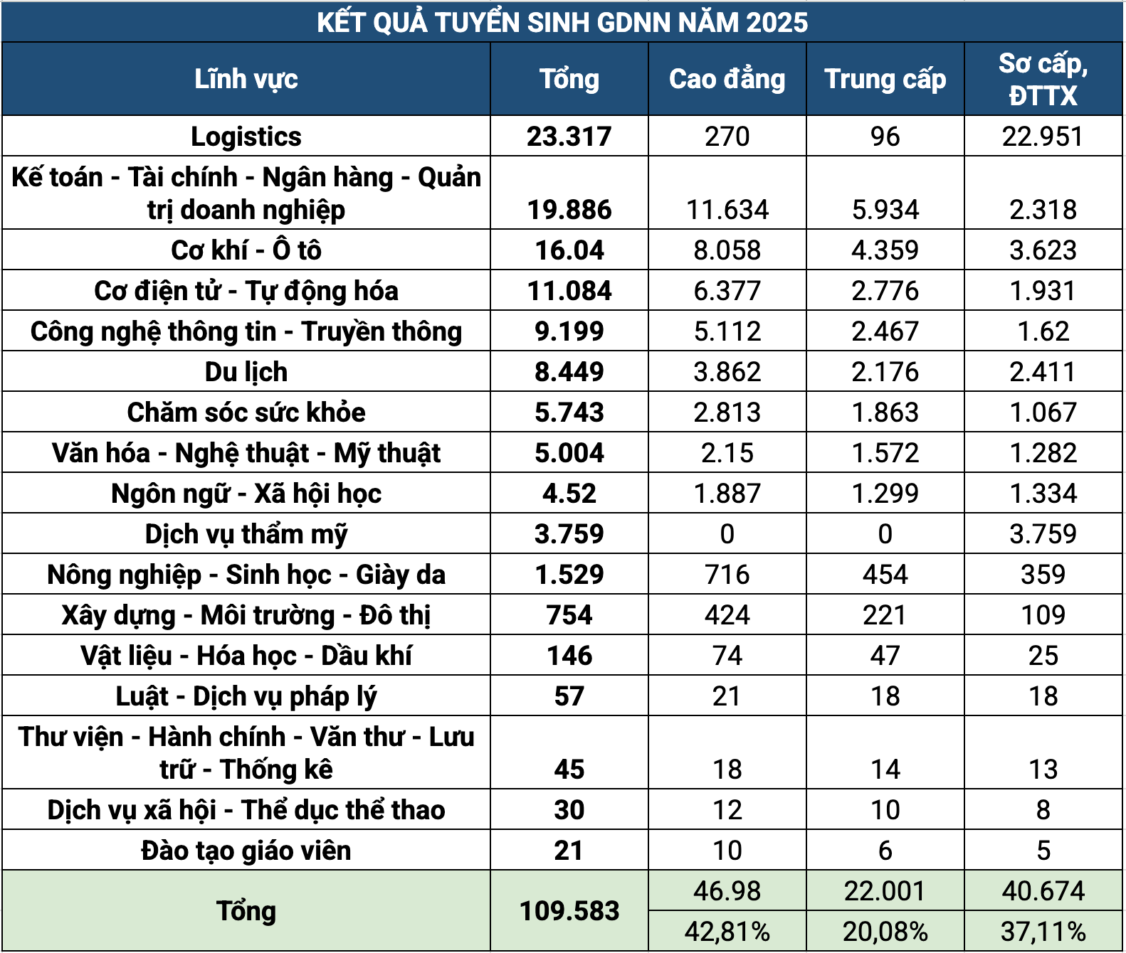 Cụ thể, theo báo cáo, logistics là lĩnh vực có số lượng tuyển sinh cao nhất toàn hệ thống với 23.317 người học, chiếm hơn 21% tổng số tuyển mới. Tuy nhiên, điểm đáng chú ý là phần lớn người học tập trung ở trình độ sơ cấp và đào tạo thường xuyên (22.951 người), trong khi cao đẳng và trung cấp chiếm tỷ lệ rất nhỏ.