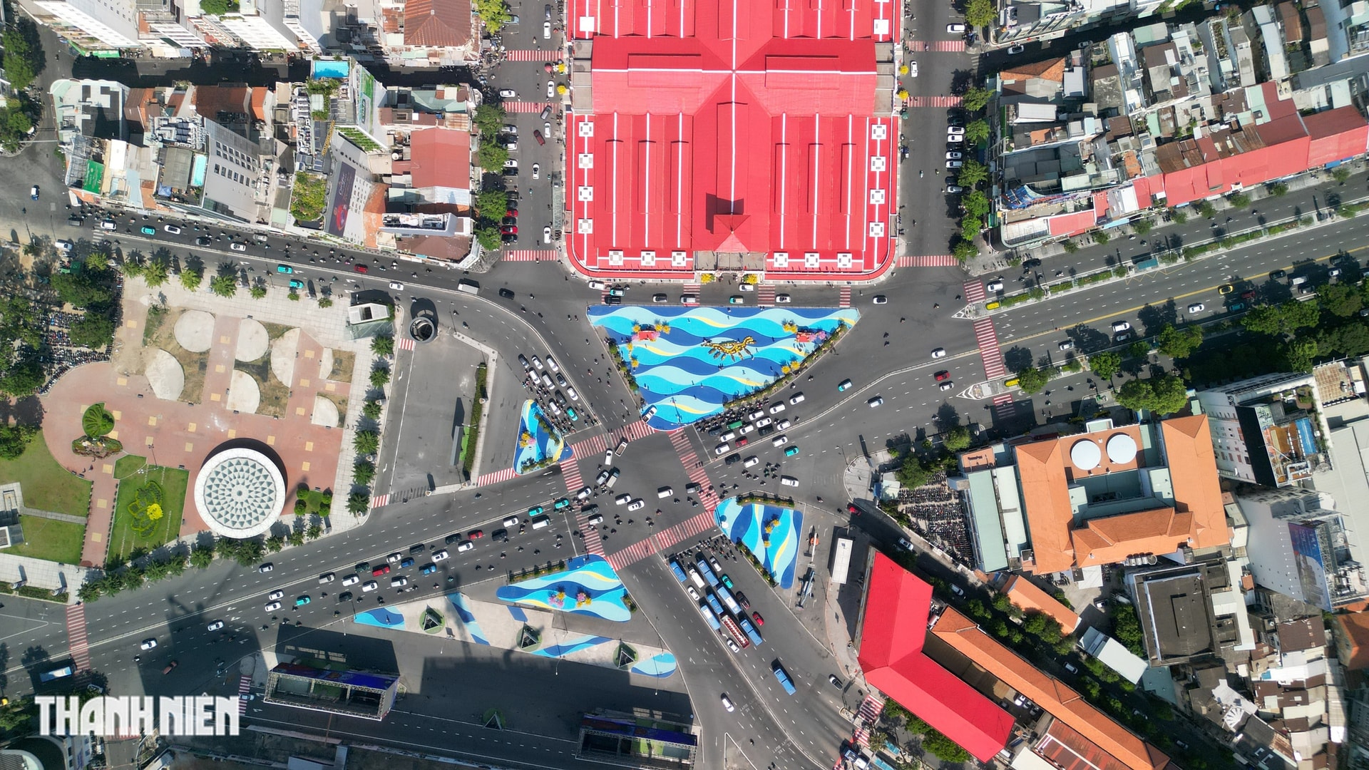 Tại khu vực quảng trường phía trước chợ Bến Thành có 4 cụm được sơn các hoa văn theo kiểu gợn sóng với nhiều gam màu vàng, xanh nhạt, đậm khác nhau.