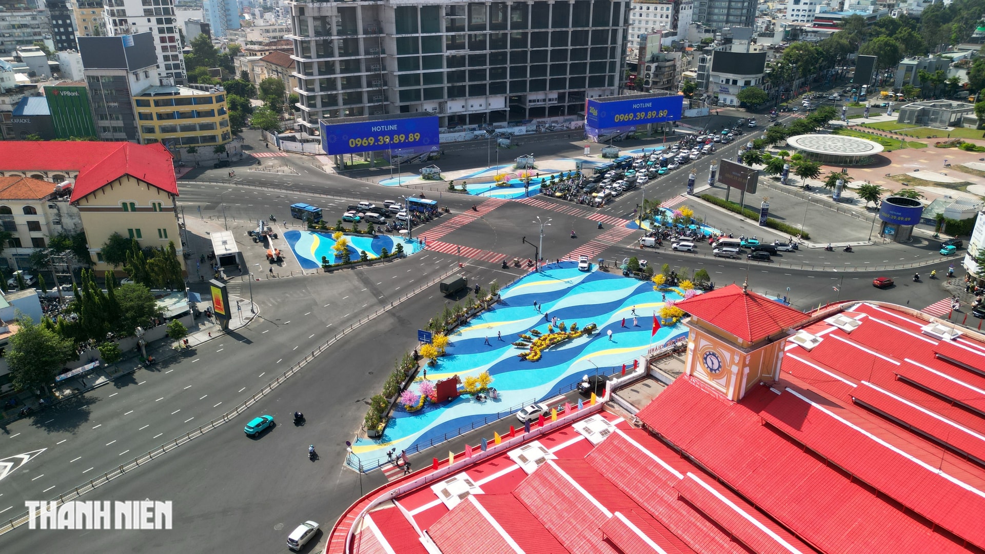 Sáng nay, khu vực quảng trường trước chợ Bến Thành đã được tháo dỡ rào chắn sau nhiều ngày thi công chỉnh trang, sơn sửa đón Tết Bính Ngọ.
