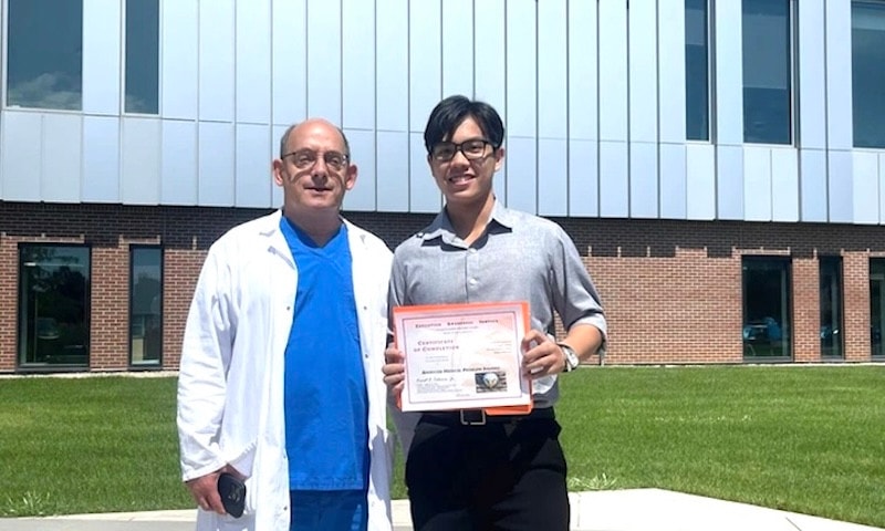 Âu Nhật Huy vừa tốt nghiệp ngành Y khoa, khóa YK7 của Trường Đại học Tân Tạo với GPA đạt 3.8/4.0 (xuất sắc); chứng chỉ TOEIC 940/990. Nam sinh là đồng tác giả của 6 bài báo khoa học. Anh từng tham gia thuyết trình tại 3 hội thảo khoa học quốc tế (Hội nghị tim mạch Đông Nam Á 2024 tại Singapore, Hội nghị tim mạch tại Chicago, Mỹ năm 2025, Hội nghị lồng ngực tại San Francisco, Mỹ).