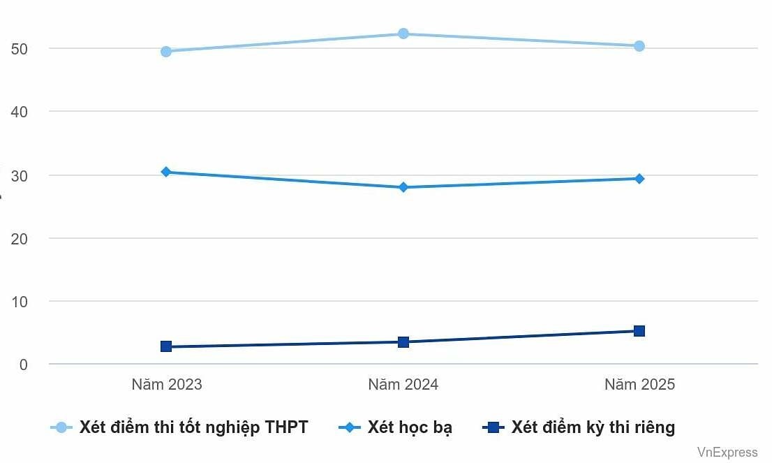 Tỷ lệ thí sinh vào đại học năm 2025 nhờ điểm thi tốt nghiệp THPT giảm, trong khi dựa vào học bạ tăng, số đỗ bằng điểm các kỳ thi riêng lần đầu vượt 5%.