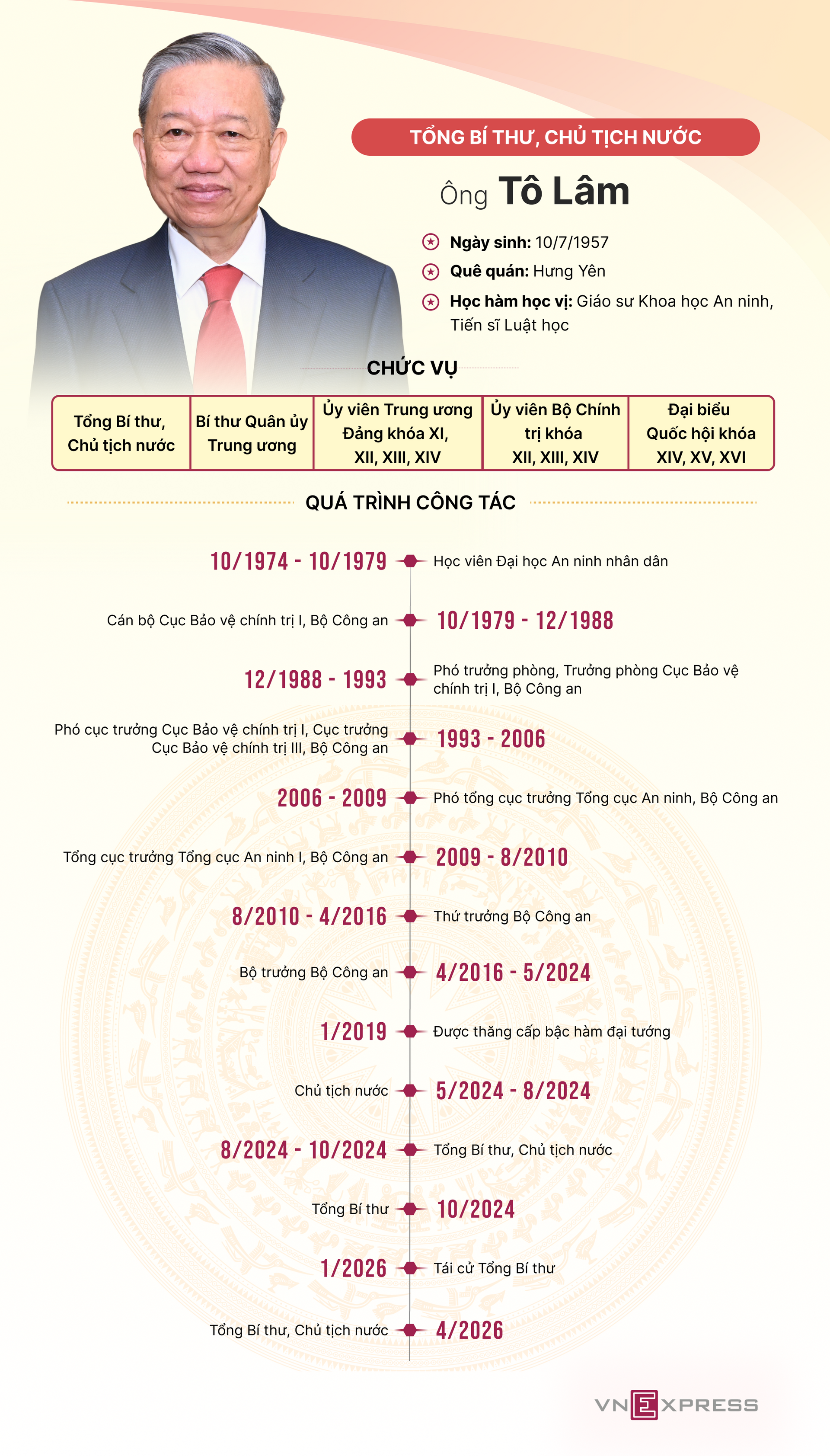 Trước khi được bầu giữ chức Chủ tịch nước nhiệm kỳ 2026-2031, Tổng Bí thư Tô Lâm từng có 3 tháng kiêm nhiệm hai cương vị năm 2024 và có 8 năm làm Bộ trưởng Công an.