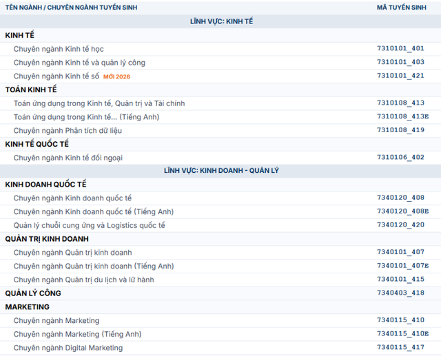 Năm 2026, trường dự kiến tuyển sinh 3.200 chỉ tiêu (tăng 500 chỉ tiêu so với năm 2025). Danh mục ngành tuyển sinh năm 2026 của trường cụ thể như sau: