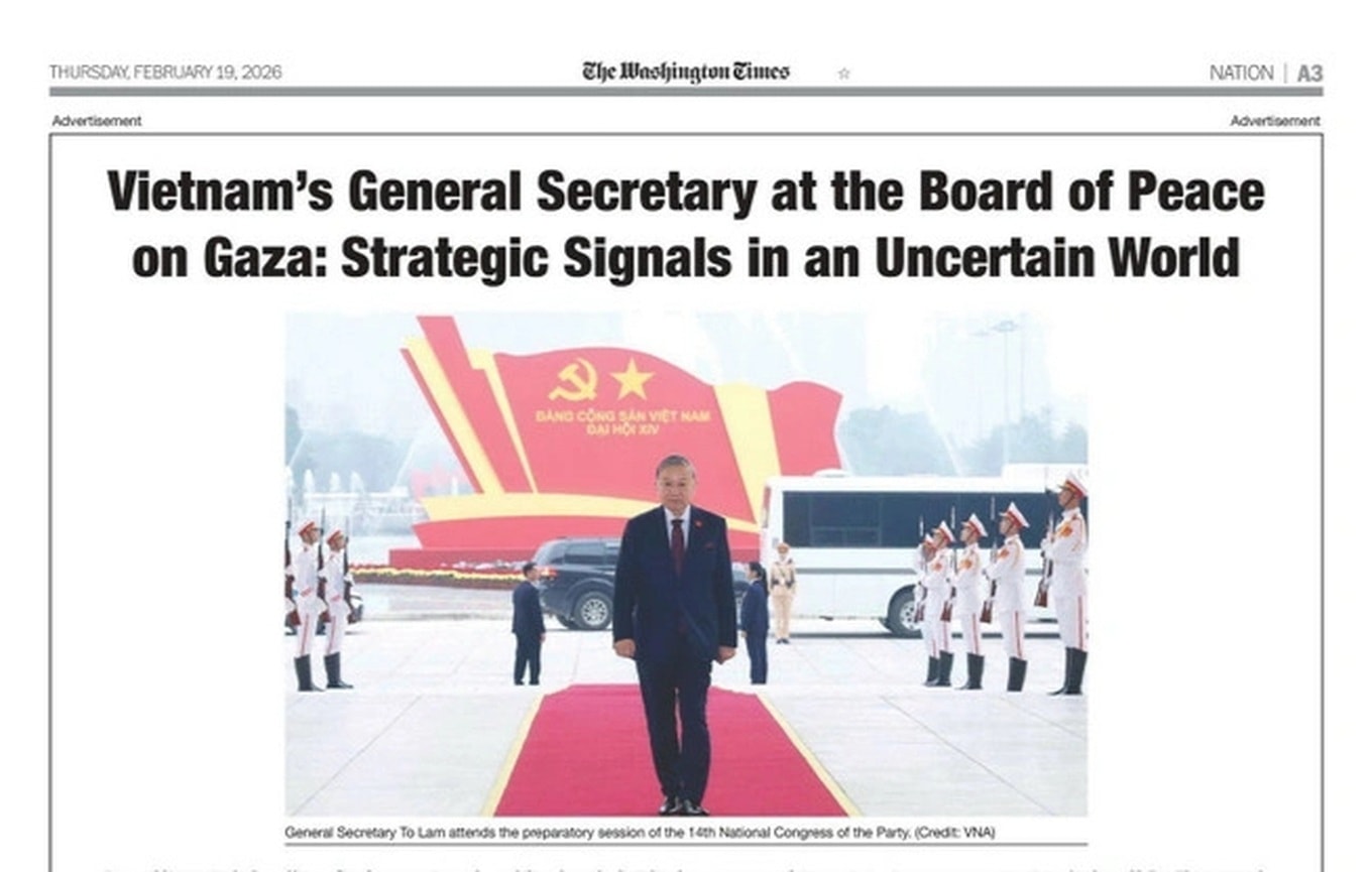 Nhân dịp Tổng Bí thư Tô Lâm tham dự phiên họp khai mạc Hội đồng Hòa bình về Gaza tại Mỹ, tờ The Washington Times số ra ngày 19/2 đã có bài viết đánh giá cao việc Việt Nam chủ động đóng góp cho hòa bình và ổn định toàn cầu.